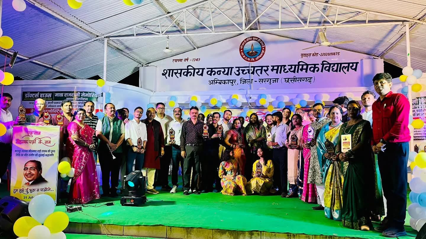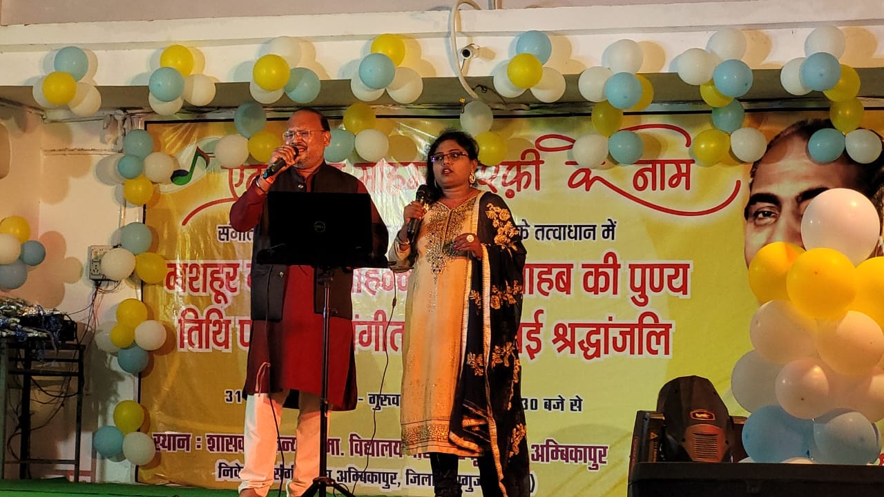 संगीत संघ व जिमनास्टिक क्लब अंबिकापुर के संयुक्त तत्वावधान में मशहूर गायक मोहम्मद रफी साहब की पुण्य तिथि पर गीत संगीत की सुरमई श्रद्धांजलि कार्यक्रम “एक शाम मोहम्मद रफी के नाम” का शानदार आयोजन किया गया। प्रत्येक वर्ष की तरह इस वर्ष भी गायक मोहम्मद रफ़ी साहब की पुण्यतिथि संगीत संघ व जिमनास्टिक क्लब अंबिकापुर द्वारा स्थानीय शासकीय कन्या उच्चतर माध्यमिक विद्यालय परिसर स्कूल रोड,अंबिकापुर में महापौर श्रीमती मंजूषा भगत के मुख्य आतिथ्य, जिमनास्टिक क्लब के संरक्षक मृगेंद्र सिंह देव, भाजपा जिला उपाध्यक्ष अंबिकेश केशरी, हिन्दी साहित्य परिषद के अध्यक्ष विनोद हर्ष, सेवा किटी समूह की अध्यक्ष सुश्री वंदना दत्ता तथा आकाशवाणी अंबिकापुर के उद्घोषक पद्मनाभ शर्मा के विशिष्ट आतिथ्य में आयोजित कार्यक्रम में शहर के उभरते गायक कलाकारों को आयोजन समिति ने रफ़ी साहब के गानों को प्रस्तुत करने के लिए मंच प्रदान किया।
