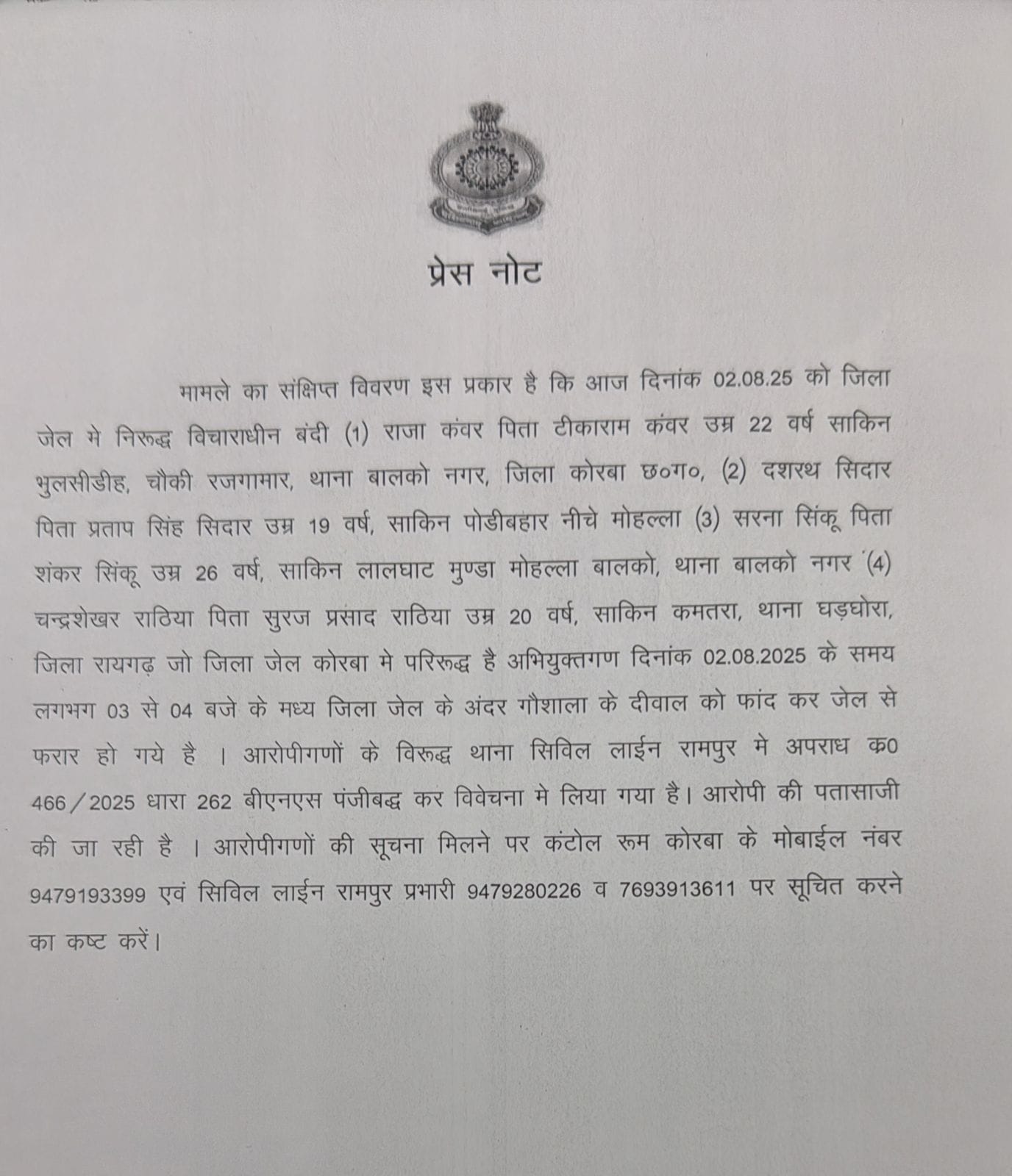 कोरबा जिले की जिला जेल से एक विचाराधीन कैदी के फरार होने की घटना से हड़कंप मच गया है। घटना की जानकारी मिलते ही कोरबा पुलिस ने तुरंत इलाके में नाकेबंदी कर दी है और फरार कैदी की तलाश में कई स्थानों पर छापेमारी शुरू कर दी गई है।