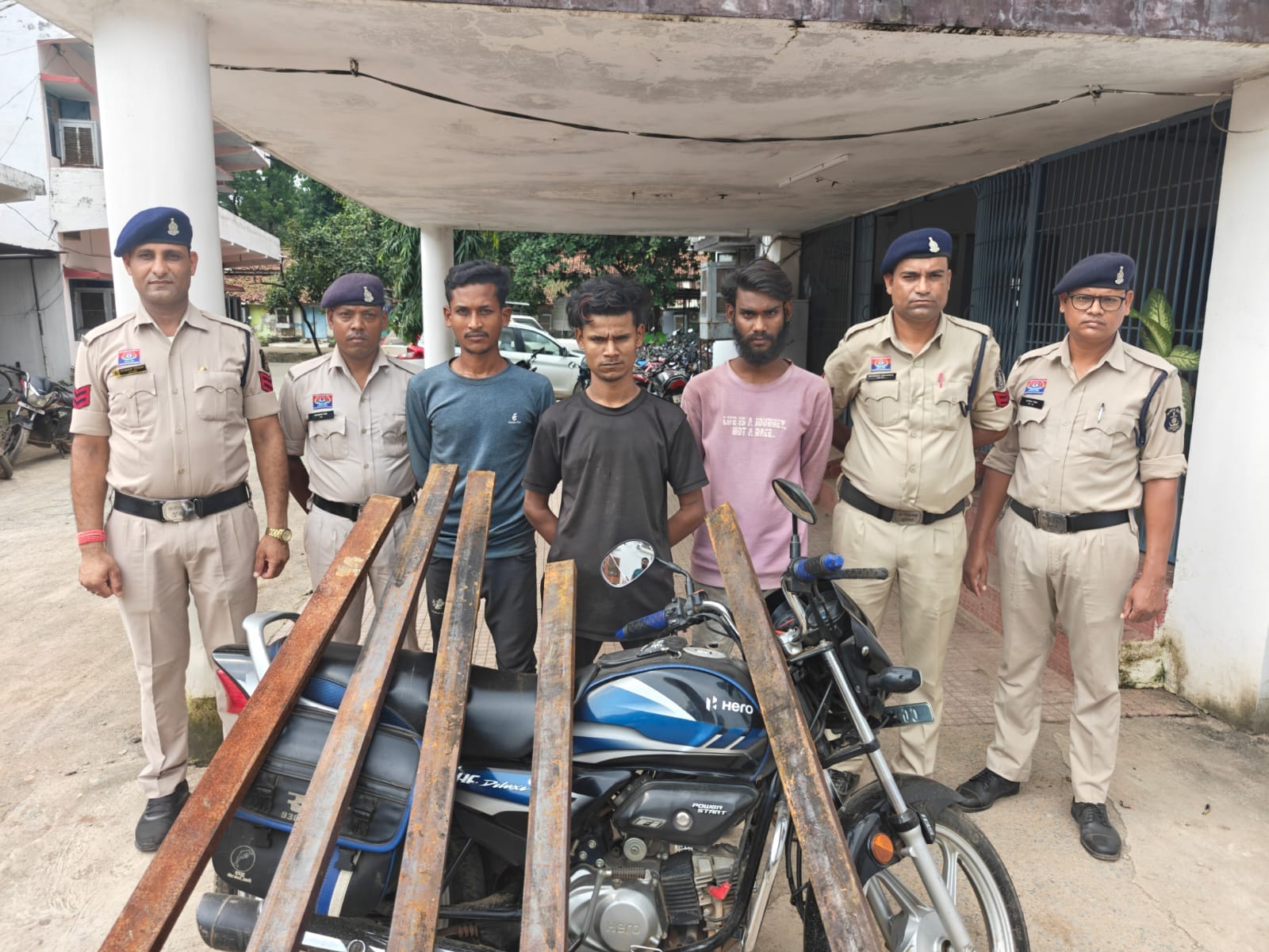 प्रार्थी प्रमोद कुमार चैहान निवासी सराईपाली, पोरथा रिपोर्ट दर्ज कराया कि मकान निर्माण में काम आने वाले चैनल गाटर कुल 35 नग खरीदा था जिसकी किमती 65450/- रूपये जिसे मुरली तम्बोली निवासी गायत्री मंदिर रोड सक्ती के निर्माणधीन मकान में इस्तेमाल किया जाना था मुरली तम्बाली के घर के छत के उपर दिनांक 30.06.2025 को रखा था। जो दिनांक 05.08.2025 को देखा तो सभी चैनल गाटर मुरली तम्बोली के छत के उपर नही था कोई अज्ञात व्यक्ति द्वारा चोरी कर ले गया है कि रिपोर्ट पर अपराध पंजीबद्ध कर विवेचना कार्यवाही में लिया गया। चोरी गये चैनल गाटर की पतासाजी के दौरान मुखबिर से सूचना प्राप्त हुआ कि आरोपीगण के द्वारा लोहे गाटर को काटना देखना बताये। मुखबिर की सूचना का तस्दीक कर आरोपी सदर को तलब कर पुछताछ कर मेमोरेण्डम कथन दर्ज किया गया है। अपने अपने मेमोरेण्डम कथन में घटनास्थल से 35 नग लोहा के चेनल गाटर किमती 65450 रूपये को चोरी करना तथा घुमन्तु वाले कबाडी के पास में बेचना और बेचने से प्राप्त रकम को खर्चा करना बताये। 01. दुर्गेश बरेठ पिता सुरज बरेठ उम्र 21 वर्ष सा० वार्ड नंबर 11 गायत्री मंदिर सक्ती थाना सक्ती जिला सक्ती छ०ग० 02. शिवा सोनी पिता श्रवण कुमार सोनी उम्र 22 वर्ष सा० राजा पारा के आगे वार्ड नंबर 16 सक्ती थाना सक्ती जिला सक्ती छ०म० 03. पुष्पेन्द्र शर्मा पिता दया किशन शर्मा उम्र 25 वर्ष साठ वार्ड नंबर 13 बैगापारा सक्ती थाना सक्ती जिला सक्ती के निशानदेही पर 05 नग लोहे के चेनल गाटर किमती 2400 रूपये तथा घटना में प्रयुक्त एक मोटर सायकल हिरो कंपनी का एच एफ डिलक्स नंबर सीजी 11 बी की 5060 को मुताबिक जप्ती पत्रक के जप्त कर कब्जा पुलिस लिया गया है। आरोपीगण के विरूद्ध धारा सदर का सबूत पाये जाने से आरोपियों को विधिवत दिनांक 06.08.2025 गिरफ्तार कर न्यायिक रिमांड पर जेल भेजा गया है।