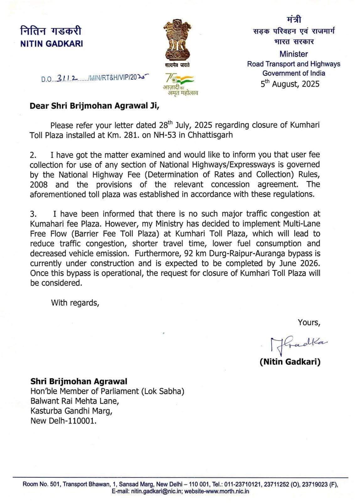 इस महत्वपूर्ण फैसले के पीछे प्रधानमंत्री श्री नरेन्द्र मोदी और केंद्रीय सड़क परिवहन मंत्री श्री नितिन गडकरी के नेतृत्व और दूरदर्शिता को अहम माना जा रहा है। सरकार की भारतमाला परियोजना के अंतर्गत आरंग-रायपुर-दुर्ग 6 लेन बाईपास का निर्माण कार्य तेज़ी से प्रगति पर है। इस बाईपास के पूरा होते ही भारी और हल्के वाहनों को शहर के भीतर से नहीं गुजरना पड़ेगा और सीधे इस बाईपास के माध्यम से यात्रा कर सकेंगे, जिससे कुम्हारी टोल प्लाज़ा की उपयोगिता स्वतः समाप्त हो जाएगी।