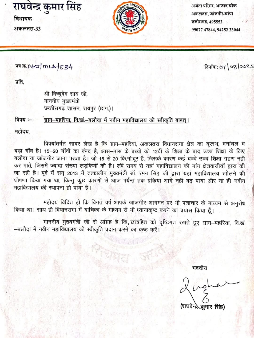 माननीय मुख्यमंत्री विष्णुदेव साय जी के जांजगीर-चाम्पा जिले में आगमन के अवसर पर अकलतरा विधानसभा क्षेत्र के विधायक श्री राघवेंद्र कुमार सिंह जी ने क्षेत्रवासियों की एक लंबे समय से लंबित माँग की ओर ध्यान आकृष्ट कराया है। उन्होंने ग्राम पहरिया (विकासखंड बलौदा) में शासकीय महाविद्यालय की स्थापना की माँग को पुनः जोरदार तरीके से उठाया।