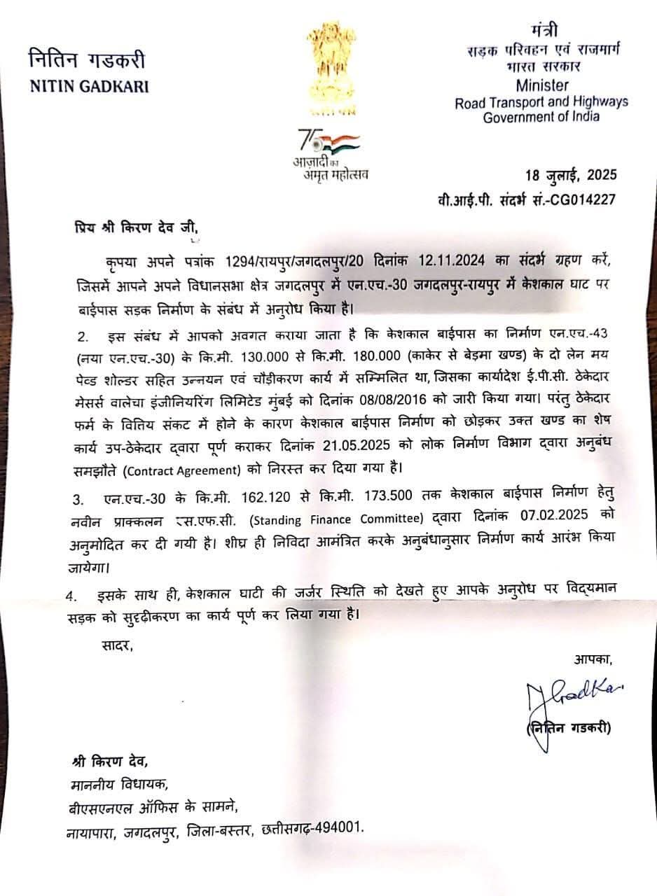 = किरण देव के आग्रह पर केंद्रीय मंत्री गडकरी ने दी स्वीकृति, भेजा पत्र भी =