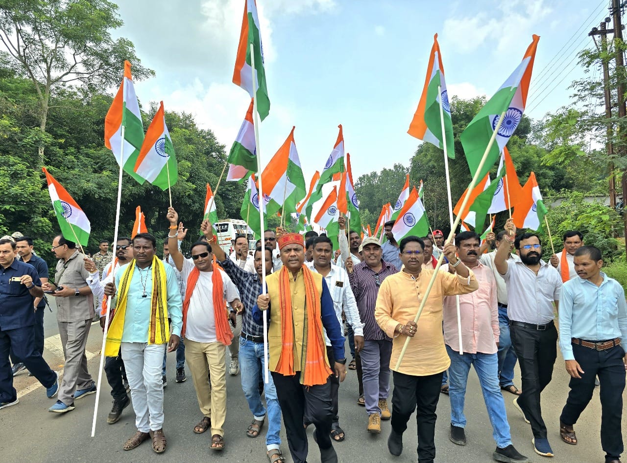 जगदलपुर। छत्तीसगढ़ के वन, जलवायु परिवर्तन एवं सहकारिता मंत्री केदार कश्यप आज देशभक्ति के रंग में पूरी तरह रंगे नजर आए। मंत्री केदार कश्यप राष्ट्र ध्वज और देश की आन, बान, शान के लिए हाथों में तिरंगा थामकर सड़कों पर निकल पड़े थे। उनके साथ देशभक्त युवाओं का लंबा कारवां था। सभी के दिलों में देशभक्ति की भावना हिलोरें मार रही थीं।