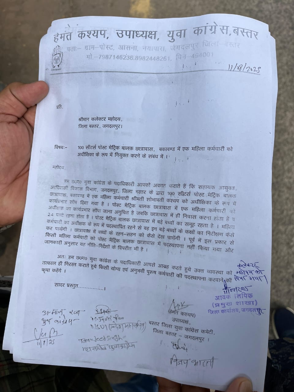 बकावंड। सौ सीटर बालक छात्रावास बकावंड में एक महिला कर्मचारी को अधीक्षिका नियुक्त किए जाने के खिलाफ बस्तर जिला युवा कांग्रेस के जिला उपाध्यक्ष हेमंत कश्यप ने मोर्चा खोल दिया है। युवा नेता हेमंत कश्यप ने इस निर्णय के विरोध में कलेक्टर बस्तर एवं आदिम जाति कल्याण विभाग के सहायक आयुक्त को ज्ञापन सौंपा है।
