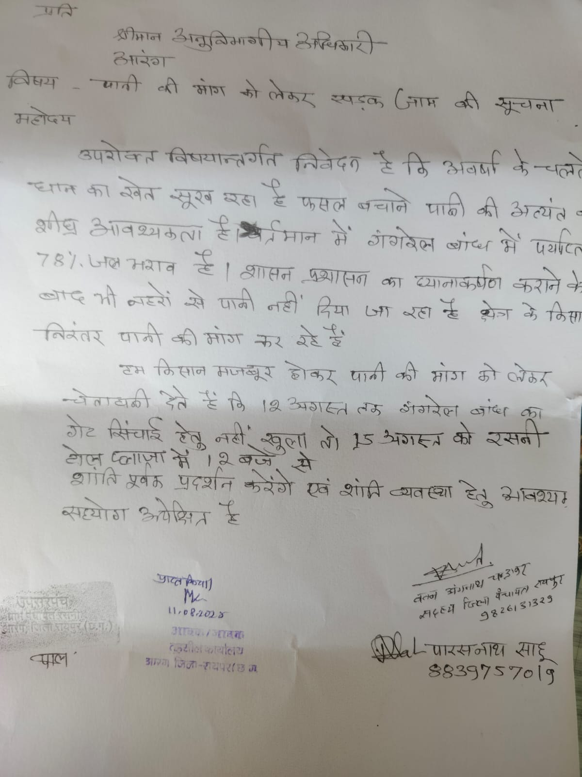 किसान नेता पारसनाथ साहू जिला पंचायत सदस्य वतन चन्द्राकर ने शासन प्रशासन को धान फसल बचाने के लिये सभी नहरों से शीघ्र पानी देने की मांग किया है 12अगस्त तक गंगरेल बांध से पानी नहीं छोडे जाने पर 15अगस्त को नेशनल हाईवे रसनी टोल प्लाजा मे 12बजे से मेगा चक्का जाम करने की चेतावनी पत्र के माध्यम से एस डी एम व पुलिस प्रशासन को दे दिया गया है चक्का जाम की तैयारी जोर शोर से जारी है अधिकांश गांव से पांच से दस ट्रैक्टर लेकर दस हजार से अधिक संख्या मे आँदोलन मे भाग लेंगे.