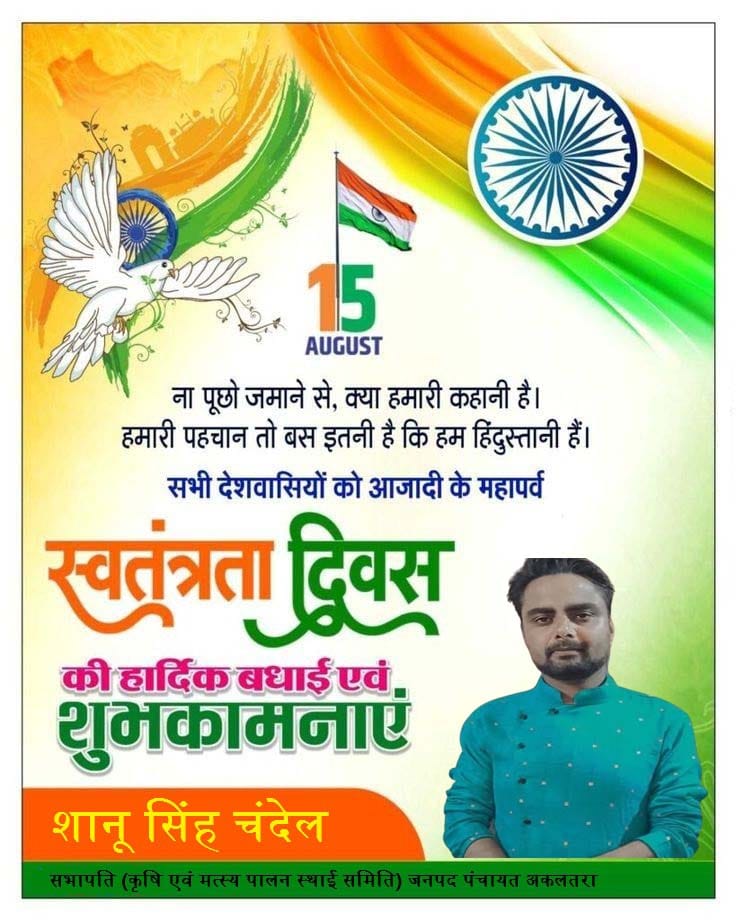 अकलतरा। जनपद पंचायत अकलतरा की कृषि एवं मत्स्य पालन स्थाई समिति के सभापति शानू सिंह चंदेल ने स्वतंत्रता दिवस के पावन अवसर पर क्षेत्रवासियों एवं समस्त देशवासियों को शुभकामनाएं दी हैं। उन्होंने कहा कि यह दिन हमारे देश की आजादी के लिए संघर्ष करने वाले महान स्वतंत्रता सेनानियों को स्मरण करने का अवसर है। हम सभी को उनके सपनों का भारत बनाने के लिए संकल्प लेना चाहिए। जय हिंद!