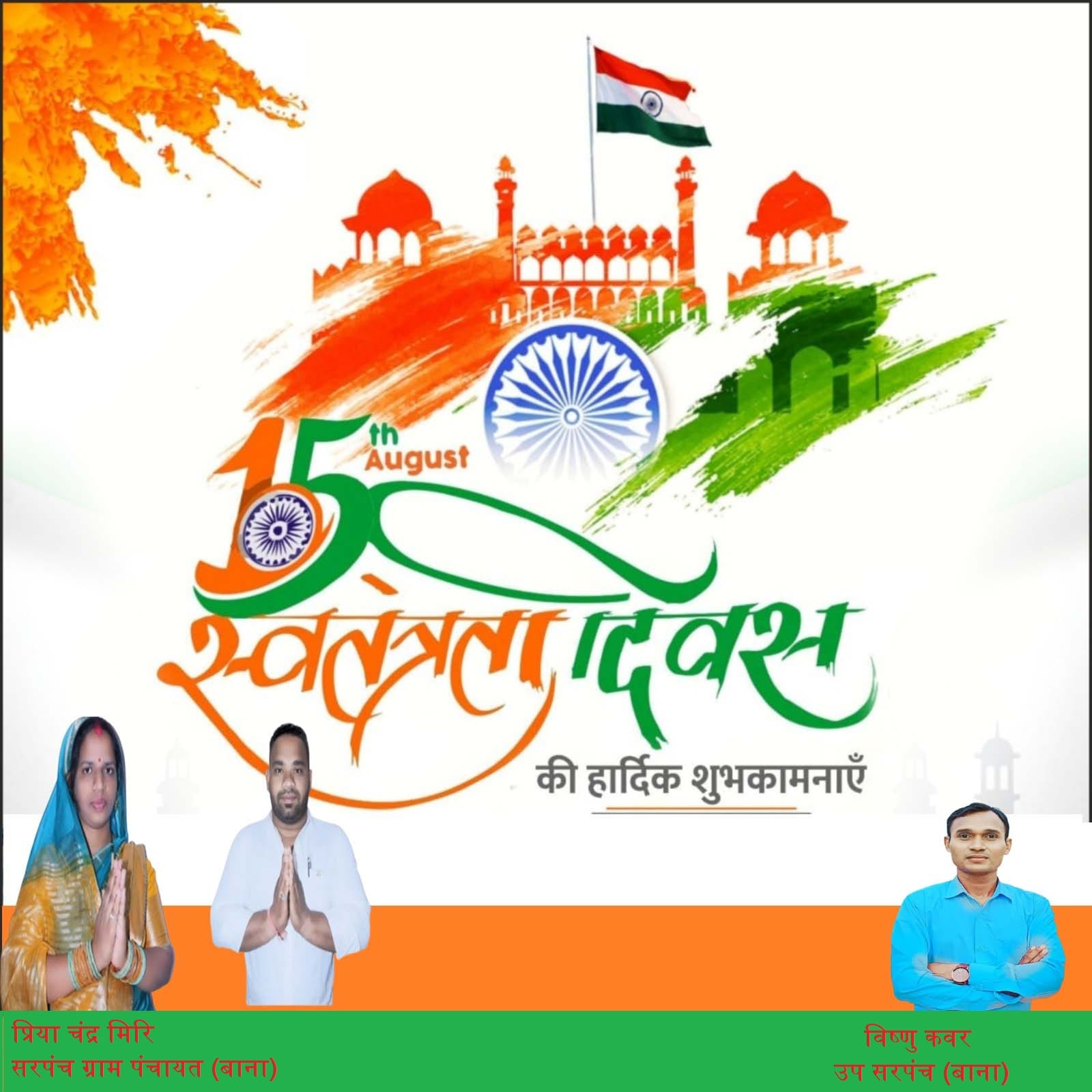 ग्राम पंचायत बाना की सरपंच प्रिया चंद्र मिरी और उप सरपंच विष्णु कँवर ने स्वतंत्रता दिवस के पावन अवसर पर क्षेत्रवासियों को हार्दिक शुभकामनाएं दी हैं। उन्होंने कहा कि यह दिन हमें देश की आज़ादी के लिए बलिदान देने वाले वीर सपूतों की याद दिलाता है और राष्ट्र के प्रति अपने कर्तव्यों को निभाने की प्रेरणा देता है। सभी नागरिक देशहित में एकजुट होकर कार्य करें — यही सच्ची श्रद्धांजलि है। जय हिंद, जय भारत!