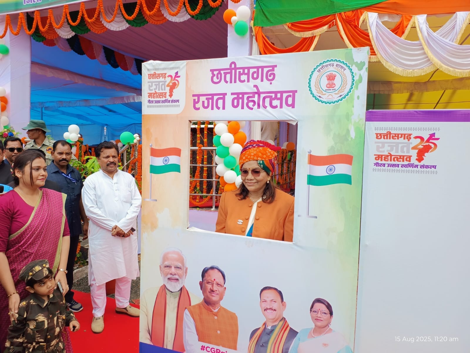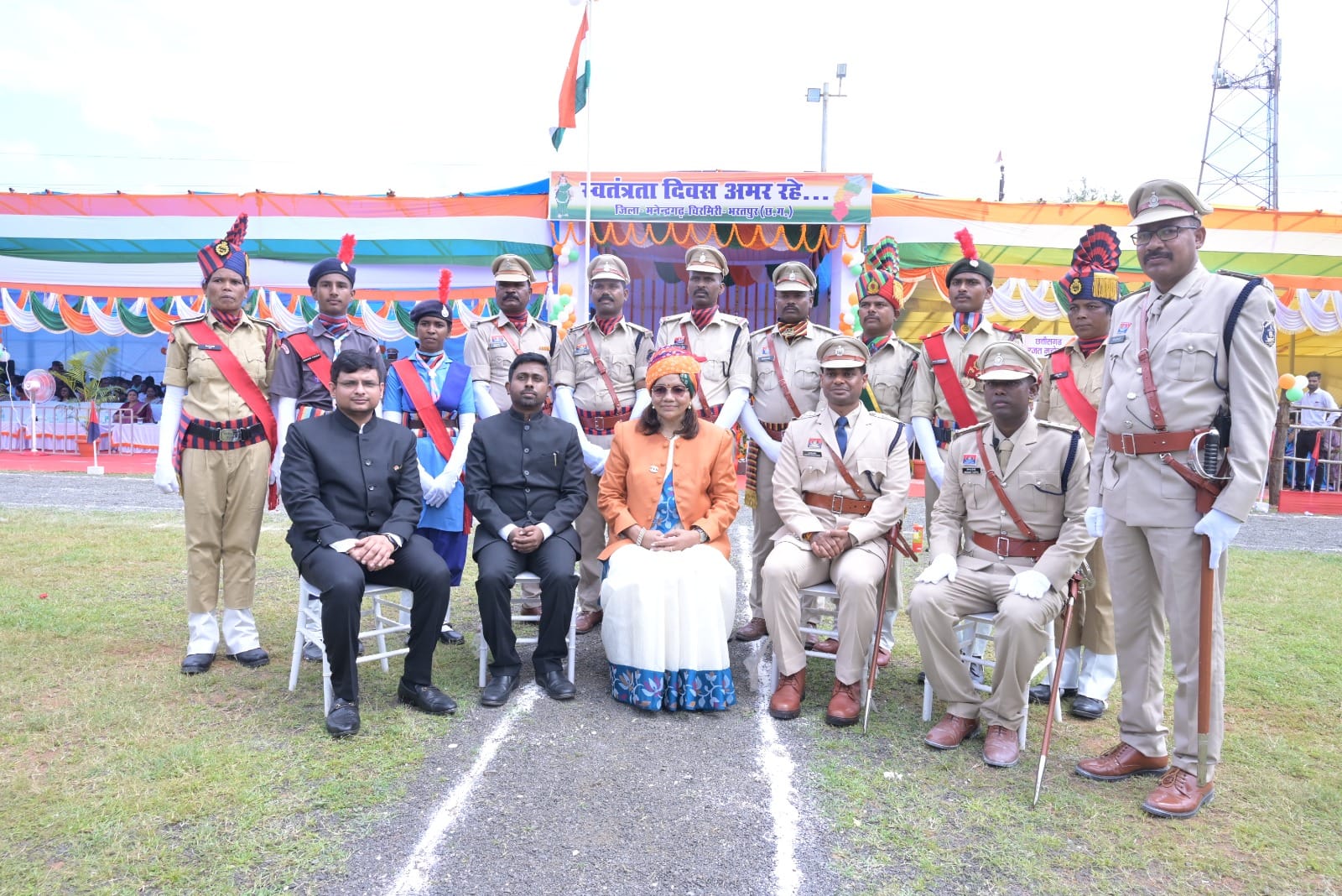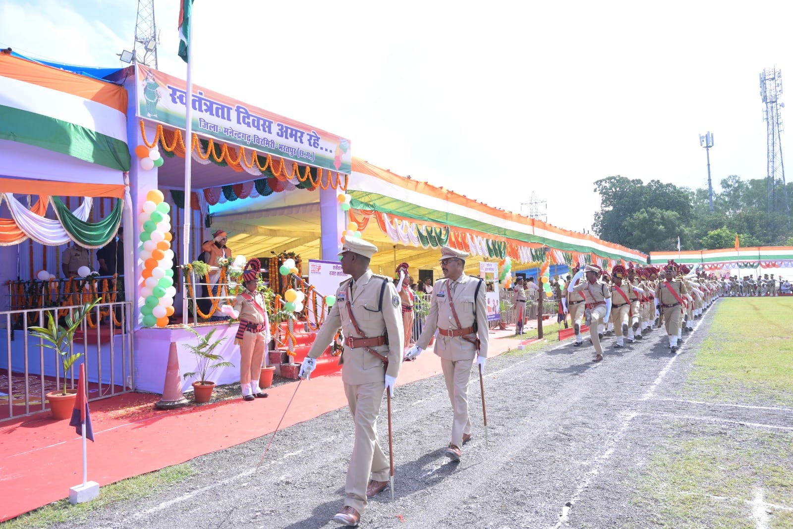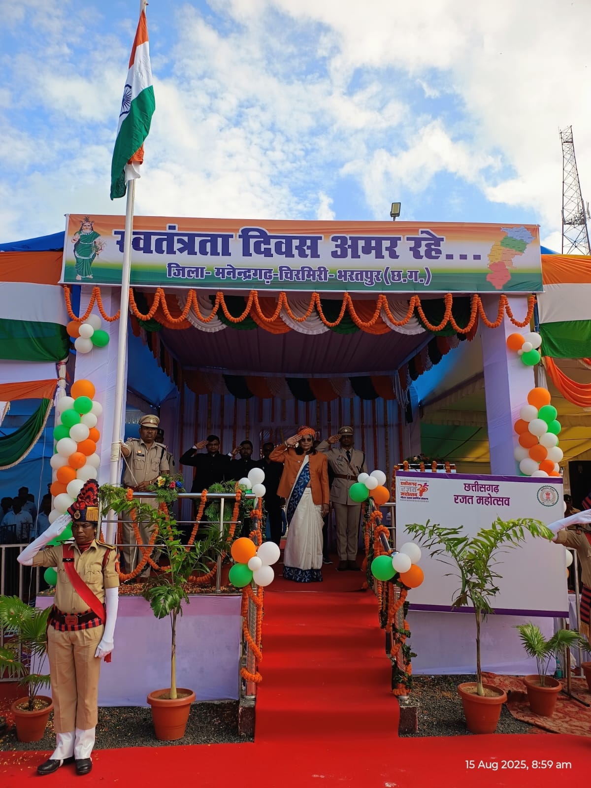 छत्तीसगढ़ सशस्त्र बल, जिला पुलिस बल पुरुष एवं महिला, नगर सैनिक बल पुरुष एवं महिला, एनसीसी बालक, स्काउट-गाइड बालक और बालिका टुकड़ियों ने सीधे कदमों से आकर्षक मार्च-पास्ट प्रस्तुत किया और जिन्हें स्मृति चिन्ह देकर सम्मानित किया गया। तत्पश्चात श्रीमती रेणुका सिंह ने रजत जयंती कार्यक्रम 2025-26 का भव्य शुभारंभ किया, जिसमें उन्होंने रजत जयंती के कार्यक्रम की सेल्फी लेते हुए हस्ताक्षर भी किए और कलेक्टर एवं एसपी के साथ सभी जनप्रतिनिधि, अधिकारी, कर्मचारियों ने हस्ताक्षर कर इस ऐतिहासिक क्षण को संजोया। इस कार्यक्रम के अंत में मंच संचालन कर रहे मंडल संयोजक संजय श्रीवास्तव एवं श्रीमती वीरांगना श्रीवास्तव की उत्कृष्ट संचालन को सराहना करते हुए कलेक्टर एवं पुलिस अधीक्षक ने दोनों को बधाई और शुभकामनाएं दीं। समारोह में कलेक्टर डी. राहुल वेंकट, पुलिस अधीक्षक चंद्रमोहन सिंह, अपर कलेक्टर अनिल कुमार सिदार, विनायक शर्मा, जिला पंचायत सीईओ अंकिता सोम शर्मा, एसडीओ ऋषभ जैन, संयुक्त कलेक्टर सी. एस. पैकरा, डिप्टी कलेक्टर श्रीमती इंदिरा मिश्रा, सीएसपी दीपका मिंज, आरआई हेमन्त टोप्पो, एएसआई रविन्द्र कुर्रे, जिला अध्यक्ष चम्पा देवी पावेल, जिला पंचायत अध्यक्ष यशवंती सिंह, विधायक प्रतिनिधि सरजू यादव, झगराखांड नगर पंचायत अध्यक्ष रीमा रमेश यादव, नई लेदरी नगर पंचायत अध्यक्ष वीरेन्द्र राणा, खोंगापानी नगर पंचायत अध्यक्ष ललिता रामा यादव, जनपद पंचायत अध्यक्ष श्रीमती जानकी बाई कुसरो, जिला पंचायत सदस्य श्रीमति अनीता सिंह, उजित नारायण सिंह, रामजीत लकड़ा, श्रीमति ममता सिंह, मनेंद्रगढ़ के सभी जनपद सदस्य, कांग्रेस जिला अध्यक्ष अशोक श्रीवास्तव, पूर्व विधायक गुलाब कमरों, मनेन्द्रगढ़ के समस्त जनपद सदस्य, सभी पार्षद एवं सभी जनप्रतिनिधियों के साथ स्कूली छात्र-छात्राएं, शिक्षक, विभागीय अधिकारी-कर्मचारी और बड़ी संख्या में जिले के शहरी एवं ग्रामीण निवासी उपस्थित रहे।
