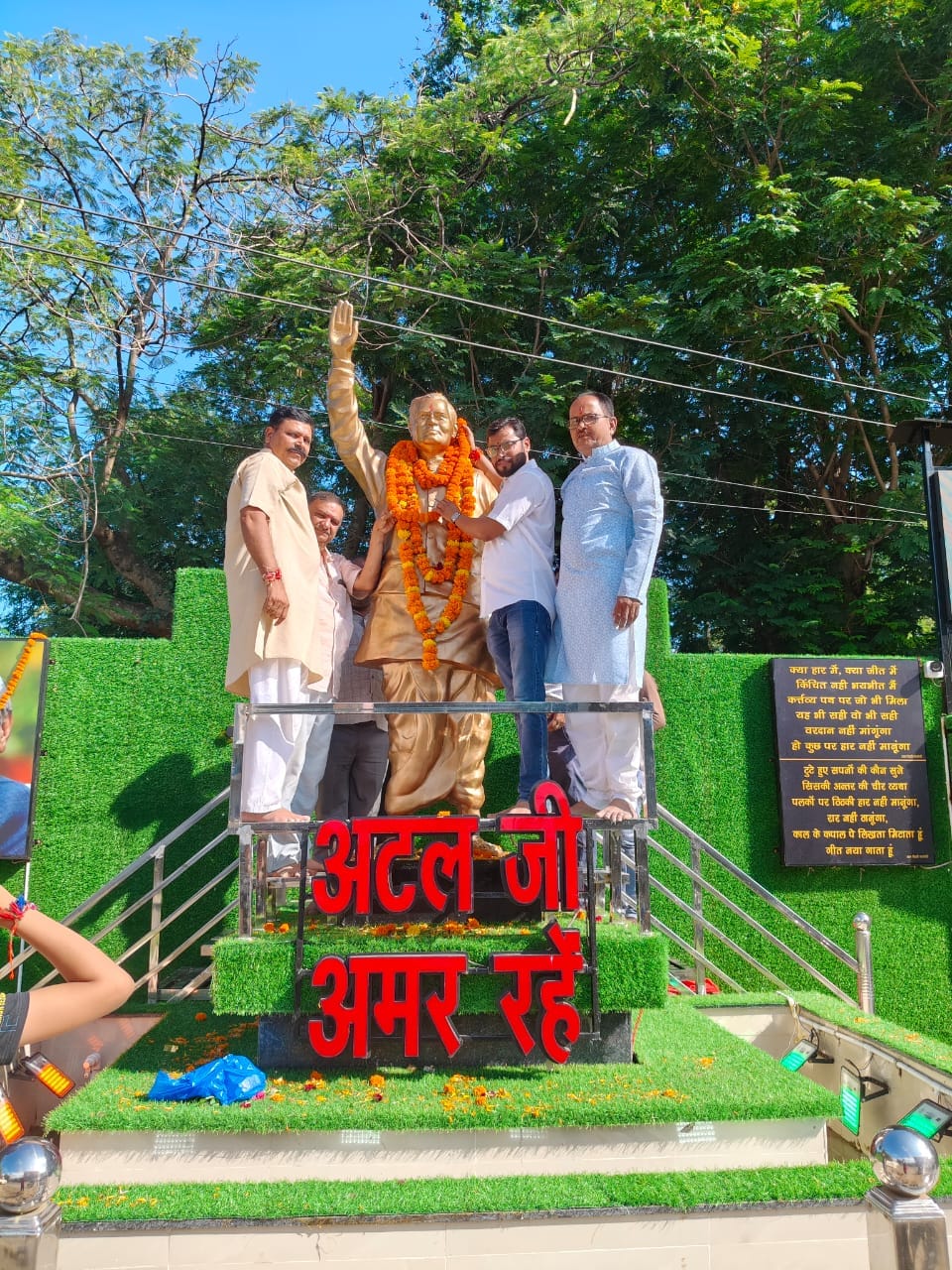 पेण्ड्रा : भारत के अनमोल रत्न, राष्ट्रनीति में शीर्ष व्यक्तित्व तथा कवि हृदय पूर्व प्रधानमंत्री स्व अटलबिहारी वाजपेयी जी की पुण्यतिथि पर क्षेत्र के साहित्यकार कवियों तथा साहित्यप्रेमियों ने उनकी नवीन स्थापित प्रतिमा पर पुष्प माल्यार्पण कर उन्हें श्रद्धांजलि अर्पित की। कला एवं साहित्य को समर्पित संस्था आनंद फाउंडेशन द्वारा तथा छत्तीसगढ़ राजभाषा आयोग के जिला संयोजक आशुतोष आनंद दुबे के संयोजन में पूज्य अटल जी को साहित्यकारों एवं साहित्यप्रेमियों ने अपनी श्रद्धांजलि अर्पित की। उपस्थित जनों में युवा कवि विश्वनाथ सोनी ने अपनी देशभक्ति रचना पाठ कर अटल जी को याद किया।