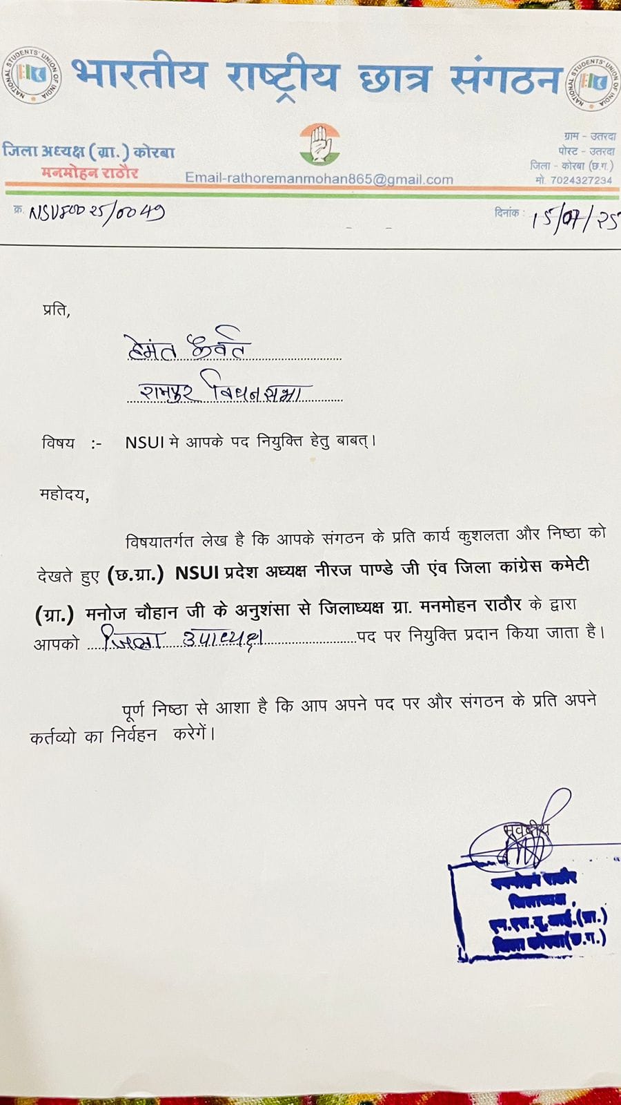 संगठन ने भरोसा जताया है कि हेमंत केवट कांग्रेस की नीतियों और विचारधारा को जन-जन तक पहुंचाने में सक्रिय भूमिका निभाएंगे और युवाओं की आवाज़ को मजबूती से आगे बढ़ाएंगे।