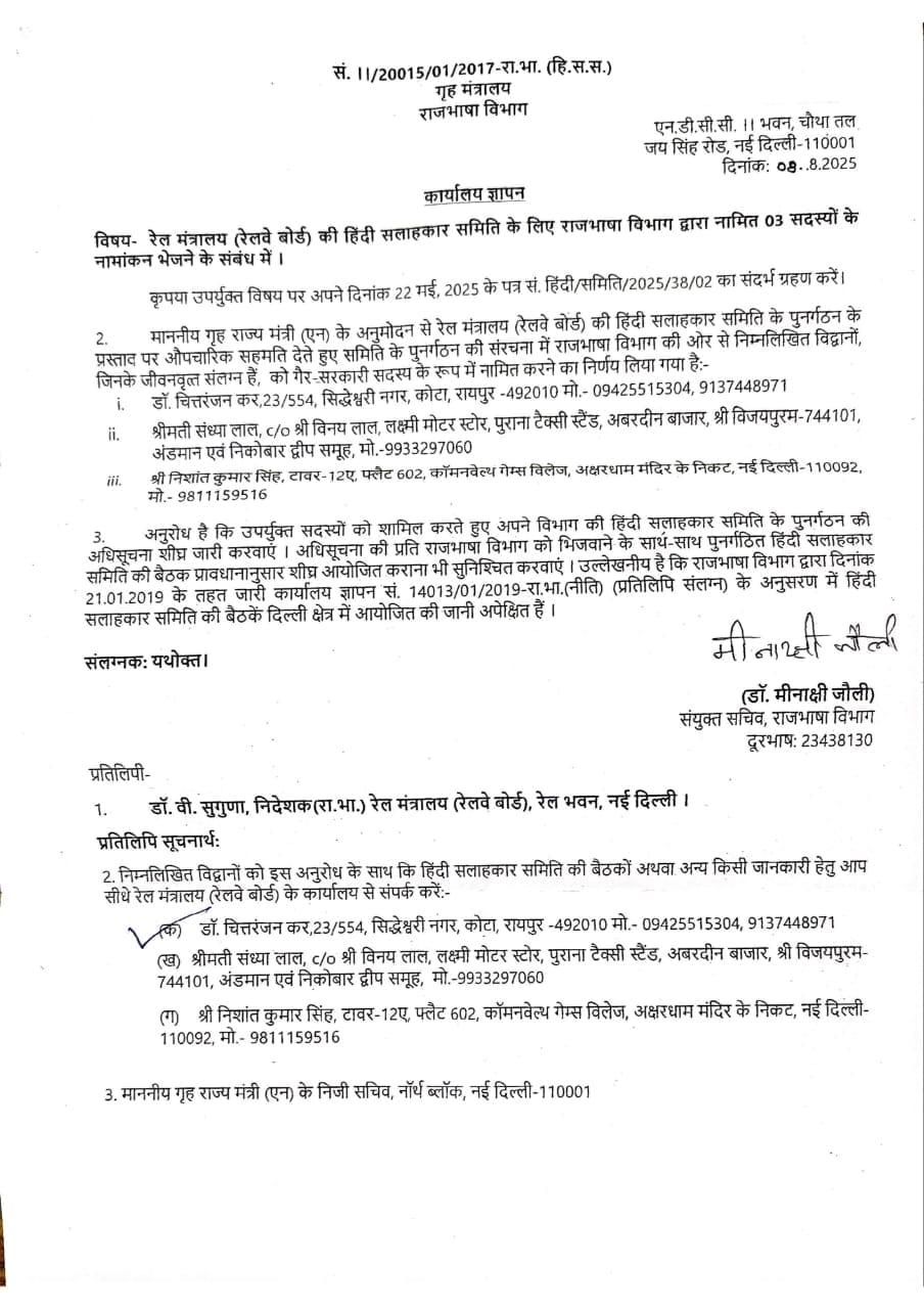रेल मंत्रालय (रेल्वे बोर्ड) की हिंदी सलाहकार समिति का सदस्य नामित किया गया है।