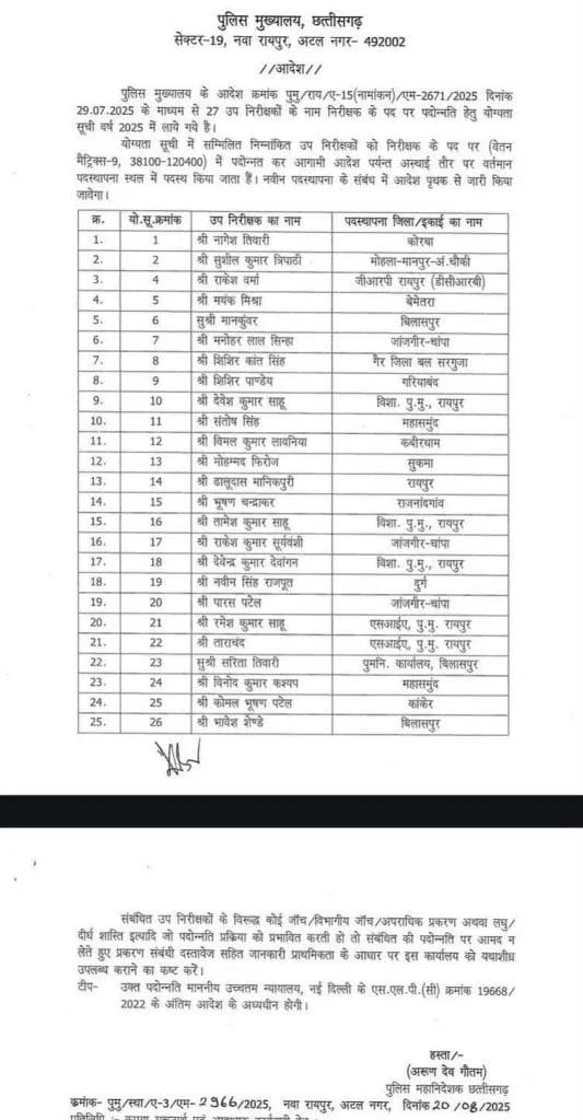 छत्तीसगढ़ पुलिस के 25 उप निरीक्षकों (SI) को वर्ष 2025 की योग्यता सूची के आधार पर निरीक्षक (TI) के पद पर पदोन्नति किया गया है, जिसका आदेश DGP अरुण देव गौतम ने जारी किया है। इन अधिकारियों को फिलहाल अस्थायी रूप से उनके वर्तमान पदस्थापना स्थल पर कार्य करने के निर्देश दिए गए हैं। नई पदस्थापना के संबंध में अलग से आदेश जारी किए जाएंगे।