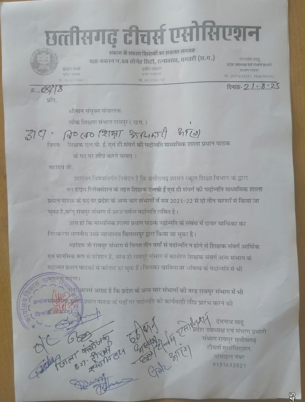 छत्तीसगढ़ टीचर्स एसोसिएशन मिडिल हेडमास्टर प्रमोशन को लेकर 1 सितंबर को करेगा जेडी कार्यालय का घेराव. बीईओ आरंग के माध्यम से दिया घेराव का अल्टीमेटम