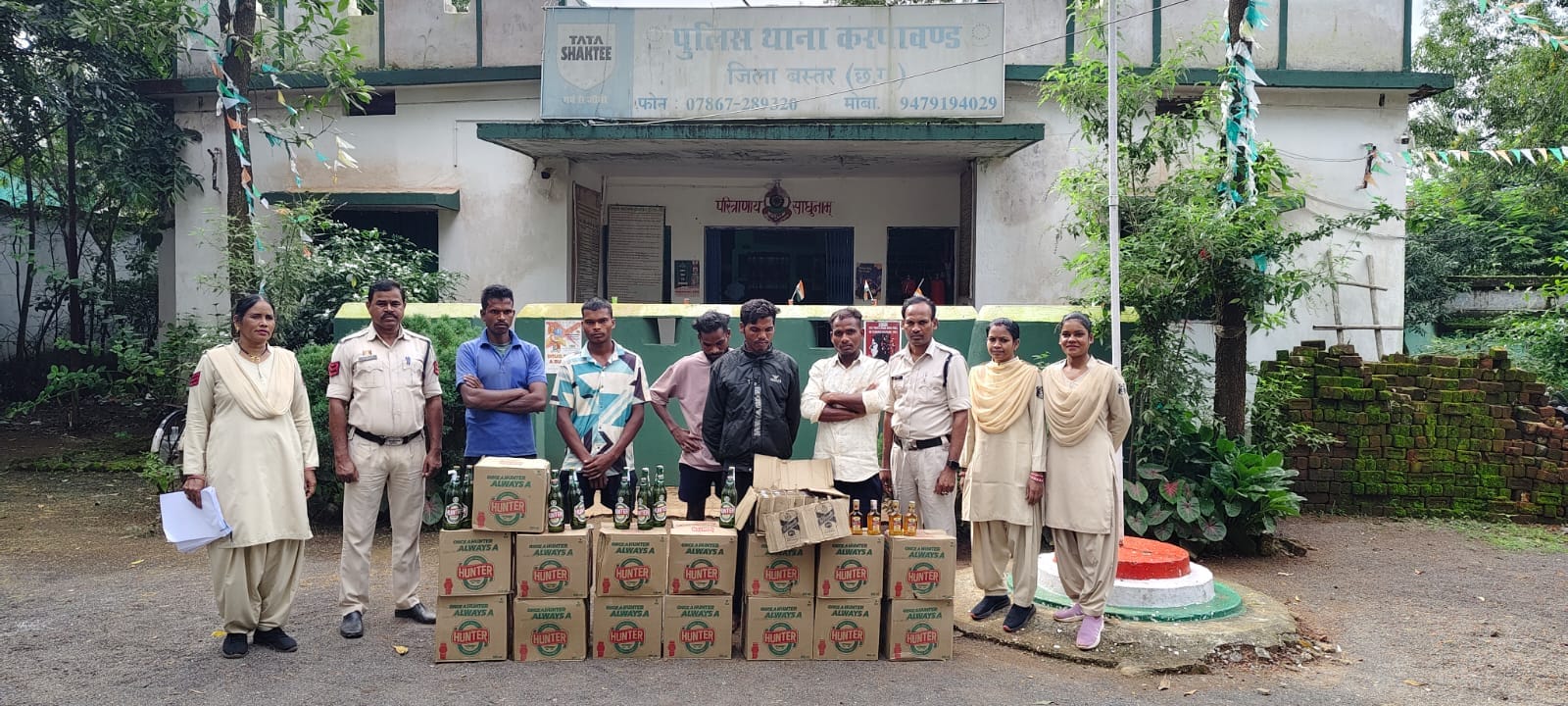 करपावंड थाना प्रभारी हरिश्चंद्र निषाद के नेतृत्व में टीम ने मुखबिरों की सूचना पर आरोपी मुन्ना सिंह पिता योगेंद्र सिंह निवासी ग्राम थाना माली, नवीनगर जिला औरंगांबाद बिहार हाल नीवास उमरकोट ओडिसा और भूजो भतरा पिता सदा भतरा निवासी धारली मुंडागुडा जिला नवरंगपुर ओडिसा को अवैध अंग्रेजी शराब परिवहन करते एवं दुर्योधन कश्यप पिता लच्छू कश्यप निवासी खास पारा जैबेल जिला बस्तर पितम नेताम पिता स्व. मंगलूराम नेताम निवासी सतोषा गौराबहार जिला बस्तर, सोनूराम नेताम पिता बिरसिंह नेताम निवासी सतोषा गौराबहार जिला बस्तर नामेराम कश्यप पिता खतकुडी कश्यप निवासी छत्तौडी नवागुडापार जिला कोंडागांव और देवेंद्र कोरार्म पिता बैसाखू राम कोरार्म निवासी छतौड़ी नयापारा जिला कोंडागांव को ग्राम जैबेल-2 कडाकाटा जंगल में परिवहन करने हेतु डंप कर रखी गई अवैध अंग्रेजी शराब के साथ करपावंड थाने की टीम के द्वारा पकड़ा गया।आरोपियों के कब्जे से ओड़िसा शासन द्वारा निर्मित 349.820 लीटर अंग्रेजी शराब जप्त की गई है।आरोपियो को गिरफ्तार कर न्यायालय में पेश किया गया, जहां से उन्हें जेल भेज दिया गया है। इस कार्रवाई में उप निरीक्षक हरिश्चंद्र निषाद, एएसआई सुखनाथ दीवान, प्रधान आरक्षक रामनाथ भारती, प्रधान आरक्षक संजीव सिंह, प्रधान आरक्षक महेन्द्र सिंह ठाकुर, कैलाश भास्कर, आरक्षक निरंजन महानदी, आरक्षक समलुराम बघेल, डीएसएफ बोहितलाल नाईक, सैनिक दीपलाल नेताम, सैनिक सतीश बघेल की मुख्य भूमिका रही।