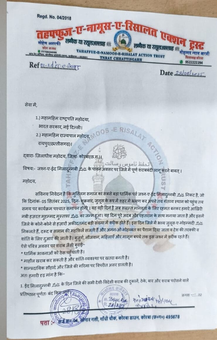 कोरबा। भाजपा प्रदेश प्रभारी, सर्व मुस्लिम जमात के मुख्या, नागरिक जन सेवा समिति, कोरबा के अध्यक्ष, अनेक संगठन के बड़े पदाधिकारी व राष्ट्रीय स्तर पर कार्य करने वाली पंजीकृत संस्था तहफ्फुज़-ए-नामूस-ए-रिसालत एक्शन ट्रस्ट के नव नियुक्त जिलाध्यक्ष मो. न्याज नूर आरबी ने आगामी 5 सितंबर को मनाए जाने वाले बड़े पर्व जश्न-ए-ईद मिलादुन्नबी ﷺ के पावन अवसर पर जिले में पूर्ण शराबबंदी लागू करने कलेक्टर के द्वारा महामहिम राष्ट्रपति महोदया, महामहिम राज्यपाल महोदय के नाम ज्ञापन सौंप मांग कर गंगा-जमुना तहजीब को आगे बढ़ाने का स्वागतेय व प्रशंसनीय कदम उठाया है है।