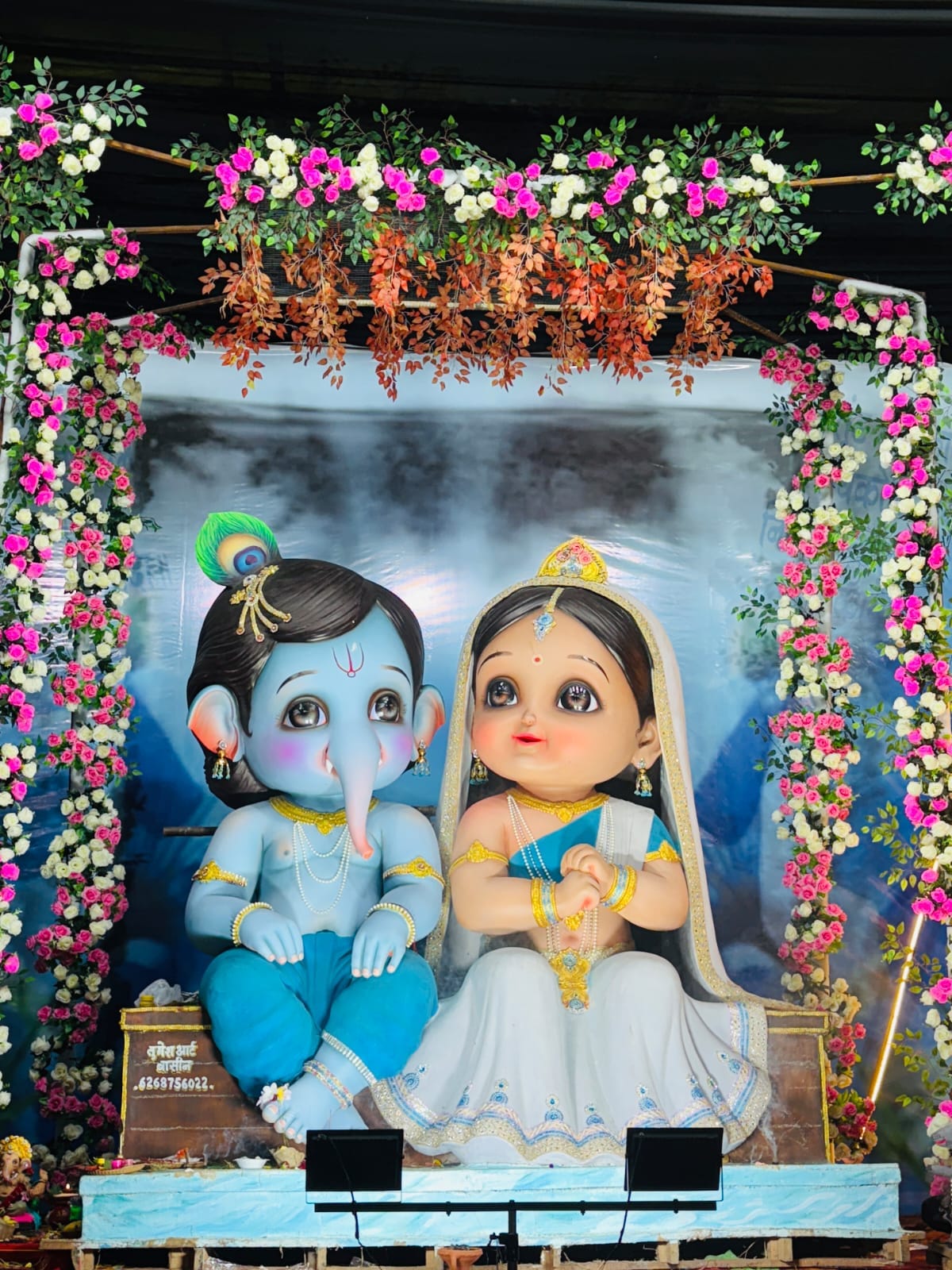 आरंग: आरंग के महामाया पारा में मां महामाया गणेशोत्सव समिति द्वारा विराजित भगवान गणेश की मनमोहक प्रतिमा सबका मन मोह रही है।इस बार बाल गणेश का कृष्ण स्वरुप और राधा रानी की चमक आरंग सहित आसपास के श्रद्धालुओं को अपनी ओर आकर्षित कर रही है। समिति के सदस्यो ने बताया कि मां महामाया गणेशोत्सव समिति द्वारा हर वर्ष प्रथम पूज्य भगवान गणेश की प्रतिमा स्थापित की जाती है।इस बार भगवान गणेश श्री कृष्ण के स्वरूप में राधा रानी के साथ विराजित है।प्रतिमा की सुंदरता और मासूमियत देखते ही बनता है।गणेश चतुर्थी के दिन से ही बड़ी संख्या में लोग इस अलौकिक प्रतिमा के दर्शन करने आ रहे है।