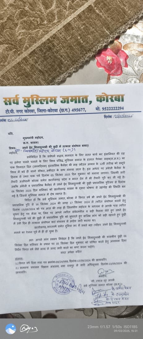 सर्व मुस्लिम जमात, कोरबा के मुख्या ने समाज की मुस्लिम समाज की तरफ से मांग स्वरूप जल्द से जल्द जश्ने ईद मिलादुन्नबी की शासकीय छुट्टी 06 सितंबर के स्थान पर 05 सितंबर को घोषित करने हेतु आवश्यक दिशा निर्देश जारी करने का कष्ट करें।