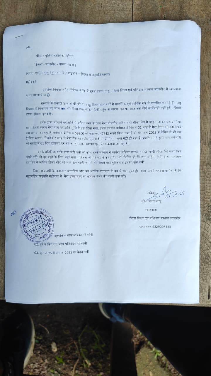 शिक्षा विभाग की गरिमा को धूमिल करने वाला सनसनीखेज मामला सामने आया है। शिक्षा एवं प्रशिक्षण संस्थान जांजगीर में पदस्थ व्याख्याता सुरेश प्रसाद साहू ने लगातार तीन वर्षों से हो रहे मानसिक और आर्थिक शोषण से त्रस्त होकर महामहिम राष्ट्रपति महोदया को इच्छा मृत्यु की अनुमति के लिए आवेदन दिया है। इस प्रकरण ने पूरे जिले में शिक्षा विभाग की कार्यशैली और जिम्मेदार अधिकारियों की भूमिका पर गंभीर प्रश्नचिह्न खड़ा कर दिया है।