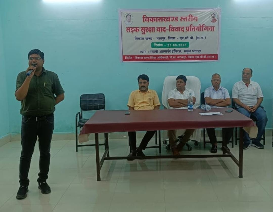 एमसीबी// भरतपुर में सड़क सुरक्षा विषयक वाद-विवाद प्रतियोगिता संपन्न, विजेताओं को चेक और प्रशस्ति पत्र देकर किया गया सम्मानित सड़क सुरक्षा और जीवन रक्षा की महत्ता पर जागरूकता फैलाने के उद्देश्य से विगत 23 अगस्त 2025 को स्वामी आत्मानंद शासकीय इंग्लिश स्कूल भरतपुर के ऑडिटोरियम हॉल में विकासखंड स्तरीय वाद-विवाद प्रतियोगिता का सफल आयोजन किया गया। प्रतियोगिता में विकासखंड के विभिन्न स्कूलों में जैसे शा.उ.मा.वि. भरतपुर, कुँवारपुर, कंजिया, कन्या उ.मा.वि. जनकपुर, शा. हाई स्कूल खमरौध, सेजेस भरतपुर, न्यू लाइफ इंग्लिश स्कूल जनकपुर तथा वंदना शिक्षा निकेतन जनकपुर के कुल 24 विद्यार्थियों ने “सड़क सुरक्षा-जीवन रक्षा” विषय पर पक्ष और विपक्ष में प्रभावशाली विचार प्रस्तुत किए।
