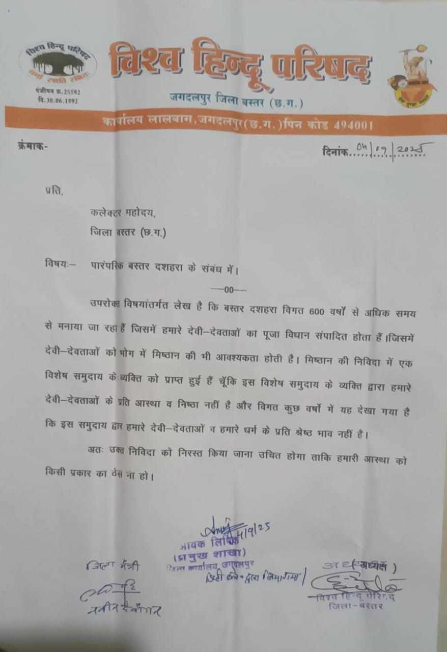 बस्तर दशहरा बस्तर संभाग समेत पूरे छत्तीसगढ़ के आदिवासियों तथा सर्व हिंदू समुदाय की आस्था से जुड़ा बड़ा पर्व है। बस्तर दशहरा का आयोजन विगत 600 वर्षों से होता आ रहा है। यह बस्तर के लोगों की आस्था, संस्कृति और परंपरा का प्रतीक है। इस पर्व पर देवी-देवताओं की पूजा-अर्चना, अनुष्ठान और भोग अर्पण अत्यंत श्रद्धा और निष्ठा से संपन्न होते आए हैं। इस वर्ष बस्तर दशहरे के प्रसाद मिष्ठान्न की निविदा एक ऐसे व्यक्ति को प्राप्त हुई है, जिसके प्रति आदिवासी समुदाय और सर्व सनातनी समाज के बड़े वर्ग में यह भावना है कि वह हमारे देवी-देवताओं और धार्मिक परंपराओं के प्रति आस्था और सम्मान नहीं रखता। विगत कुछ वर्षों के अनुभवों ने भी इस जनभावना को और प्रबल किया है। इसी वजह से उस व्यक्ति को प्रसाद मिष्ठान्न निर्माण एवं व्यवस्था का ठेका दिए जाने का पुरजोर विरोध शुरू हो गया है। ऐसे व्यक्ति के हाथों में प्रसाद की जिम्मेदारी होने से प्रसाद की पवित्रता और शुद्धता पर सवाल खड़े किए जा रहे हैं। यह सवाल हिंदूवादी संगठन खड़े कर रहे हैं। इस मसले को लेकर विश्व हिंदू परिषद के कार्यकर्ताओं ने जिला प्रशासन को ज्ञापन सौंपा है। विश्व हिंदू परिषद ने ज्ञापन में कहा है कि बस्तर दशहरे जैसे महान पर्व पर किसी भी प्रकार की लापरवाही अथवा आस्था को ठेस पहुंचाने वाला कार्य स्वीकार्य नहीं होगा। अतः हम जिला प्रशासन से आग्रह करते हैं कि उक्त निविदा को निरस्त कर इसे ऐसे व्यक्ति या संस्था को दिया जाए जो परंपरा, आस्था और श्रद्धा का पूर्ण सम्मान करता हो।विहिप ने आगे कहा है- बस्तर दशहरा केवल उत्सव नहीं, बल्कि यह हमारी अस्मिता, श्रद्धा और सांस्कृतिक धरोहर का जीवंत प्रतीक भी है। इसकी पवित्रता और गरिमा बनाए रखना प्रशासन और समाज, दोनों की सामूहिक जिम्मेदारी है। विहिप नेताओं ने इस मुद्दे को बस्तर दशहरा समिति के अध्यक्ष एवं बस्तर सांसद महेश कश्यप के समक्ष भी रखा है। इस पर श्री कश्यप ने विहिप के लोगों को भरोसा दिलाया कि वे यह इसे बस्तर दशहरा समिति में उठाएंगे। ज्ञात हो कि बस्तर सांसद परम सनातनी नेता माने जाते हैं और सनातन एवं आदिवासी परंपराओं, प्रथाओं, पूजा प्रथा के संरक्षण के लिए और कन्वर्जन के खिलाफ सदैव मुखर रहे हैं। अब देखना होगा कि बस्तर दशहरा के प्रसाद की पवित्रता एवं शुद्धता को लेकर वे क्या कदम उठाते हैं?