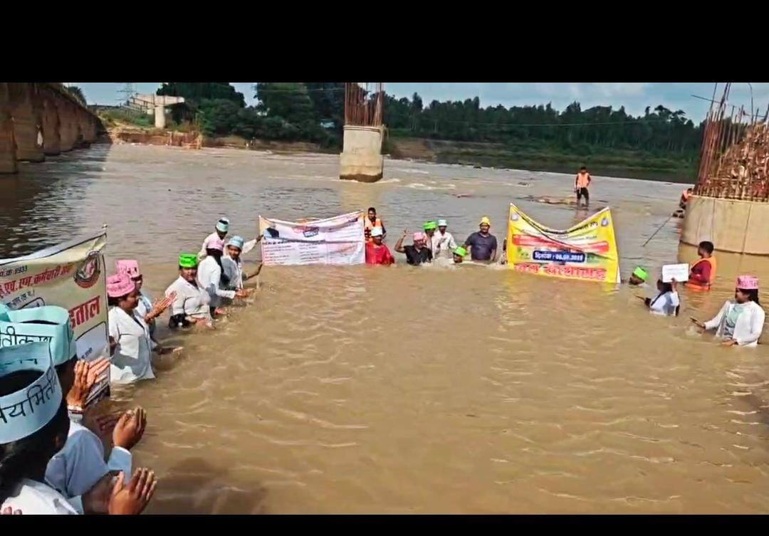 जगदलपुर। राष्ट्रीय स्वास्थ्य मिशन कर्मचारी संघ छत्तीसगढ़ के आह्वान पर संघ की बस्तर जिला इकाई के बैनर तले स्वास्थ्य कर्मी 18 अगस्त से लगातार हड़ताल पर हैं। हड़ताल के 23वें दिन आज 9 सितंबर को बस्तर जिले के एनएचएम स्वास्थ्य कर्मियों ने यहां इंद्रावती नदी में उतरकर जल सत्याग्रह किया।