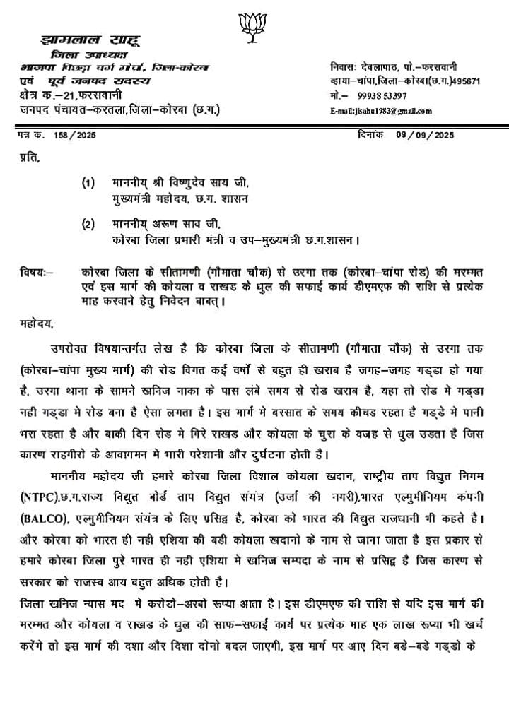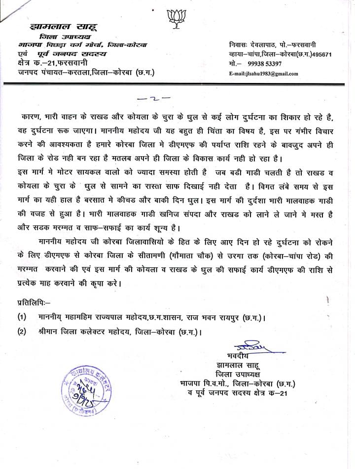 भाजपा नेता झाम लाल साहू ने पत्र मे उल्लेख किया है कि कोरबा जिला को एशिया की बड़ी कोयला खदानों के नाम से जाना जाता है, ताप विद्युत संयंत्र ऊर्जा की नगरी, एल्मुनियम संयंत्र है इस प्रकार से कोरबा जिला मे राजस्व लाभ डीएमएफ से करोडो-अरबो रुपया होता है इस डीएमएफ कि राशि से यदि इस मार्ग की मरम्मत और रोड मे गिरे राखड, कोयला के चुरा के धूल की सफाई कार्य पर प्रत्येक माह एक लाख रुपया भी खर्च करेंगें तों इस मार्ग की दशा और दिशा दोनों बदल जाएगी। लंबे समय से यह मार्ग जर्जर है बरसात मे कीचड़ रहता है और बाकी दिन गाड़ी के चलने से भारी धूल उड़ता है इस मार्ग की दुर्दशा भारी मालवाहक गाड़ी की वजह से हुआ है.। भारी मालवाहक वाहन जिला के खनिज सम्पदा और राखड को लाने-ले-जाने मे मस्त है और सड़क मरम्मत व साफ-सफाई का कार्य शून्य है।