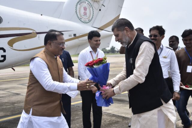 अर्जुन झा/जगदलपुर। मुख्यमंत्री विष्णुदेव साय का आज जगदलपुर में मां दंतेश्वरी हवाई अड्डे पर आत्मीय स्वागत किया गया। वे उद्योग विभाग द्वारा आयोजित इन्वेस्टर कनेक्टर और दिव्यांगजनों को सहायक उपकरण वितरण कार्यक्रम में शामिल होंगे। मुख्यमंत्री श्री साय के साथ उप मुख्यमंत्री विजय शर्मा, वन मंत्री केदार कश्यप, वाणिज्य एवं उद्योग मंत्री लखनलाल देवांगन, सांसद महेश कश्यप, मुख्यमंत्री के प्रमुख सचिव श्री सुबोध सिंह, सचिव राहुल भगत भी पहुंचे हैं। ​हवाई अड्डे पर जगदलपुर विधायक किरण सिंह देव, चित्रकोट विधायक विनायक गोयल, जगदलपुर के महापौर संजय पांडेय, पूर्व विधायक डॉ. सुभाऊ कश्यप सहित अन्य जनप्रतिनिधियों और कमिश्नर डोमन सिंह, आईजी सुंदर राज पी., कलेक्टर हरिस एस, पुलिस अधीक्षक शलभ सिन्हा ने मुख्यमंत्री और मंत्रियों का स्वागत किया।