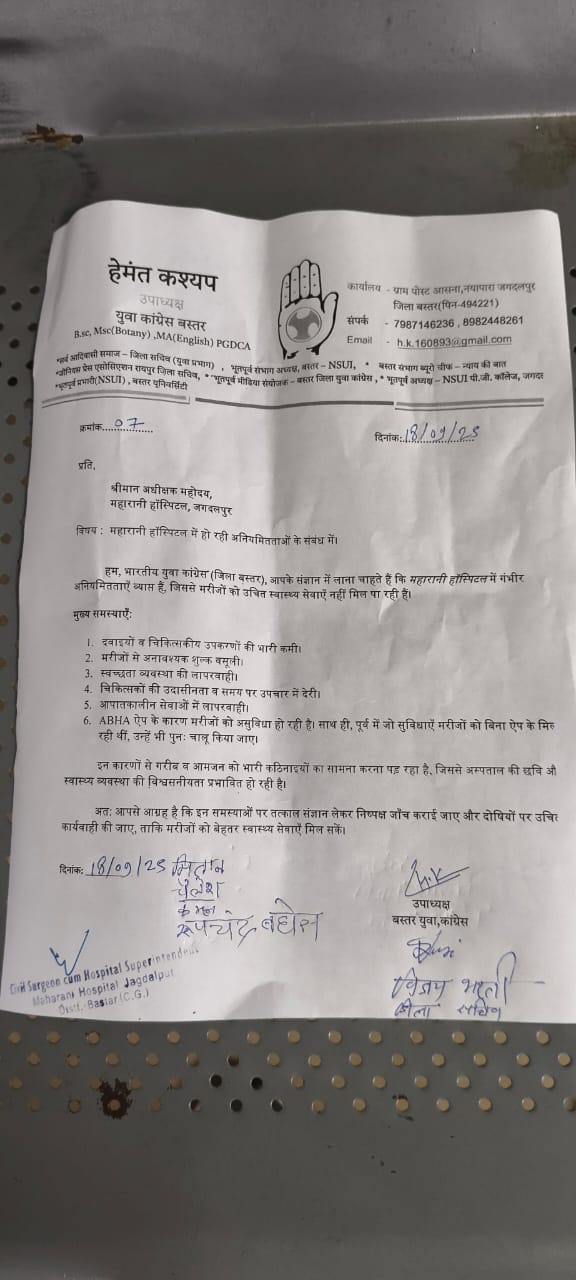 मरीजों को बेहतर एवं सुलभ स्वास्थ्य सुविधाएं उपलब्ध कराने की मांग की है। हेमंत कश्यप ने चेतावनी दी है कि यदि निर्धारित समय सीमा में ठोस कार्रवाई नहीं की जाती है, तो युवा कांग्रेस जनहित में उग्र आंदोलन करने के लिए विवश होगी। इस दौरान कांग्रेस जिला उपाध्यक्ष हेमंत कश्यप, जिला सचिव विजय भारती, कमल, रूपचंद, शैलेष, एकादशी बघेल, रामचंद्र, मितान आदि उपस्थित थे।