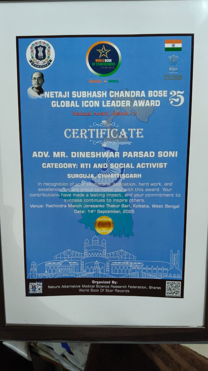 का आयोजन बेस्ट बंगाल की राजधानी कोलकाता में किया गया जिसमें भारत के विभिन्न क्षेत्रों में सामाजिक एवं कानूनी स्तर पर तथा खेल में उत्कृष्ठ कार्य करने लोगों का चयन किया गया जिसमें सरगुजा एवं सम्पूर्ण छत्तीसगढ़ राज्य में आरटीआई एवं अन्य कानून के माध्यम से लगातार सामाजिक स्तर पर उत्कृष्ठ कार्य करने के लिए अंबिकापुर के प्रतिष्ठित अधिवक्ता एवं आरटीआई कार्यकर्ता डॉ डी के सोनी को भारत के अन्य राज्यों से आए सामाजिक कार्यकर्ताओं और अलग अलग क्षेत्र के लोगों के समक्ष रविन्द्र मंच भवन ठाकुरबाड़ी कोलकाता में दिनाक 14/9/25 दिन रविवार को बेस्ट बंगाल के पूर्व राज्यपाल एवं इलाहाबाद हाईकोर्ट के पूर्व चीफ जस्टिस श्री श्यामल कुमार सेन तथा पद्म श्री पूर्णा दास बॉल सम्राट के करकमलों से बंग गौरव सम्मान के तहत नेताजी सुभाष चंद्र बोस ग्लोबल आइकन लीडर अवार्ड 2025 का अवॉर्ड दिया गया।