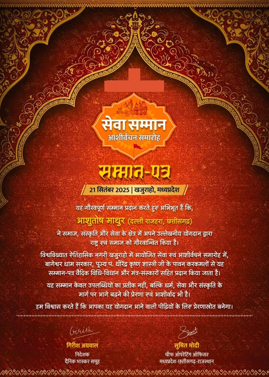 बागेश्वर धाम में इंजीनियर आशुतोष माथुर का होगा सम्मान