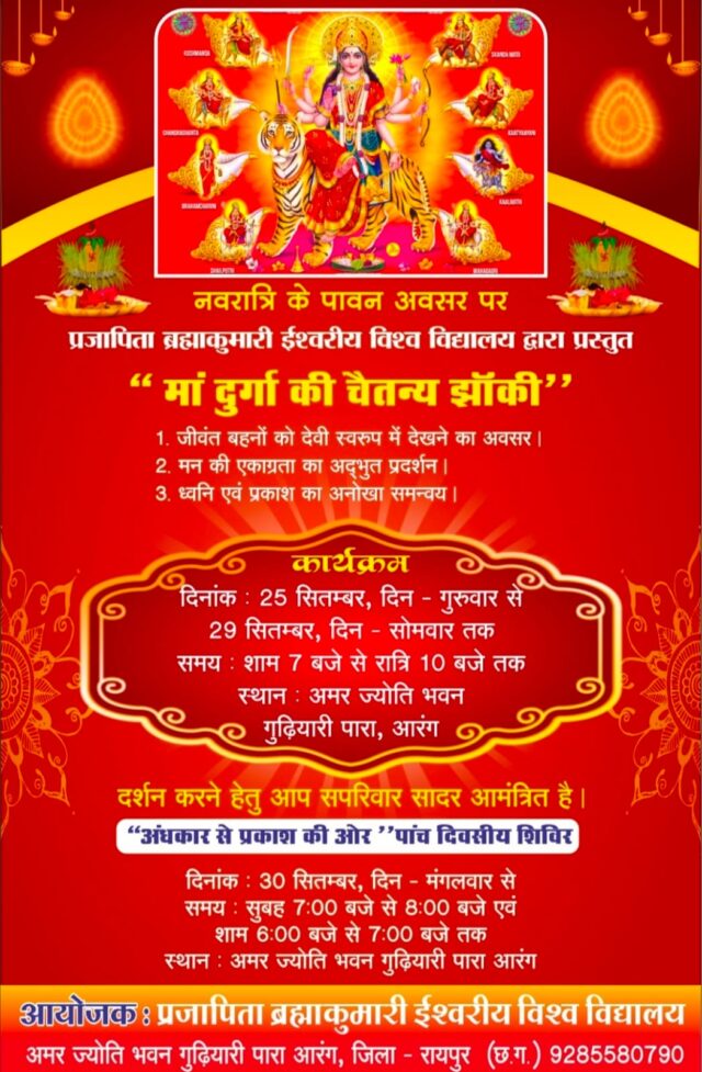 आरंग/ सोमन साहू:- नवरात्रि के पावन पर्व पर प्रजापिता ब्रह्माकुमारी ईश्वरीय विश्वविद्यालय के द्वारा गुढिय़ारी पारा आरंग स्थित स्थानीय सेवाकेंद्र अमर ज्योति भवन में चैतन्य देवियों की झांकी का आयोजन दिनांक 25 से 29 सितम्बर तक लगाया जा रहा है जिसका अवलोकन सन्ध्या 7 रात्रि 10 बजे किया जावेगा, एवं अन्धकार से प्रकाश की ओर राजयोग शिविर 30 सितम्बर तक प्रातः 7 से 8 और सन्ध्या 6 से 7 बजे तक लाभ प्राप्त किया जा सकेगा यह जानकारी एक विज्ञप्ति में सेवाकेंद्र संचालिका ब्रम्हा कुमारी लता दीदी ने बताया