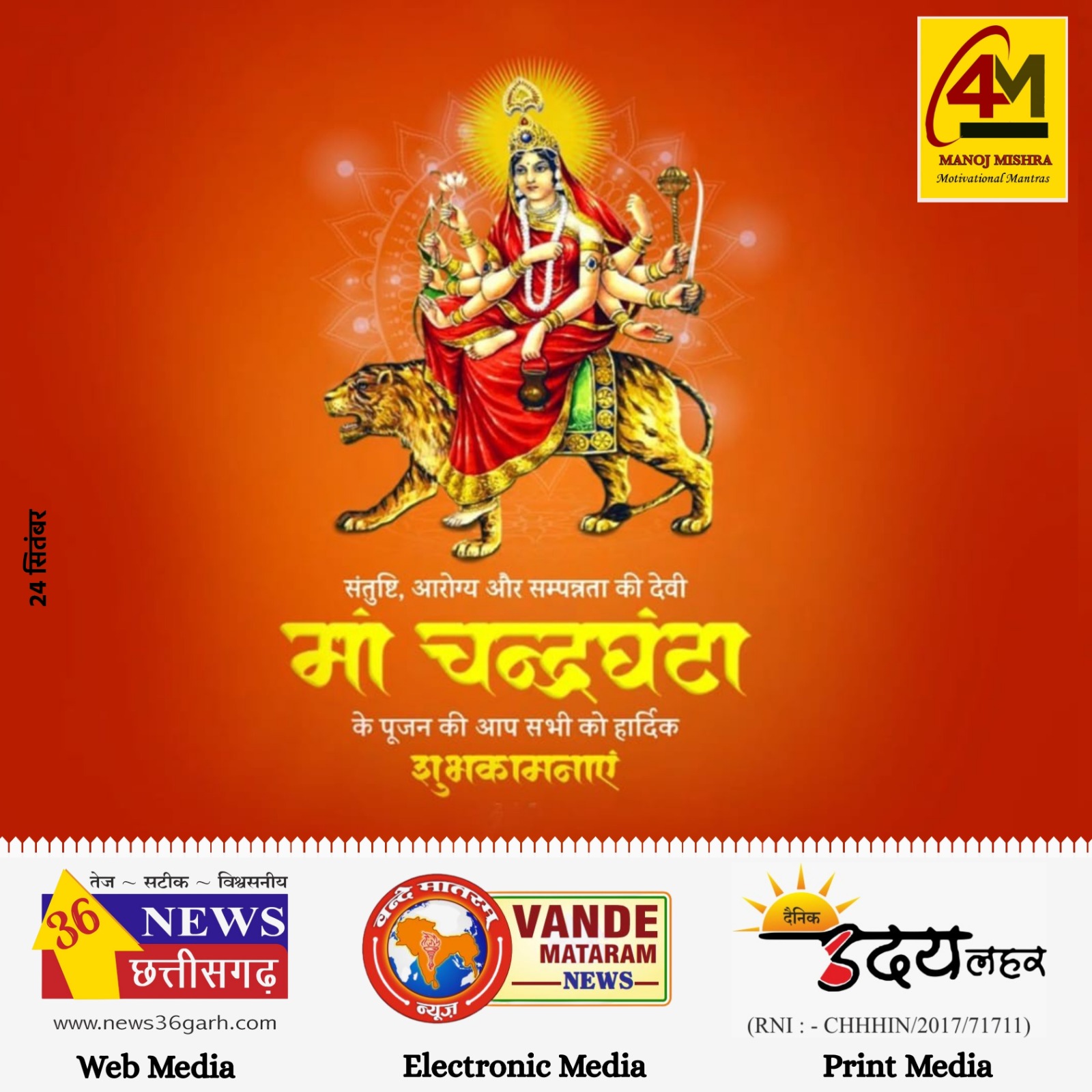 शारदीय नवरात्रि का तीसरा दिन 24 सितंबर 2025, बुधवार को है। इस दिन तृतीया तिथि पूरी रात पार करके 25 सितंबर की सुबह 7 बजकर 7 मिनट तक रहेगी। नवरात्रि के तीसरे दिन मां दुर्गा के तीसरे स्वरूप मां चंद्रघंटा की उपासना की जायेगी। देवी मां के माथे पर घंटे के आकार का अर्धचंद्र सुशोभित होने के कारण ही इन्हें चंद्रघंटा के नाम से जाना जाता है। माता चंद्रघंटा को देवी दुर्गा का उग्र रूप माना जाता है। चलिए जानते हैं मां चंद्रघंटा की पूजा विधि, भोग, मंत्र, कथा और आरती।