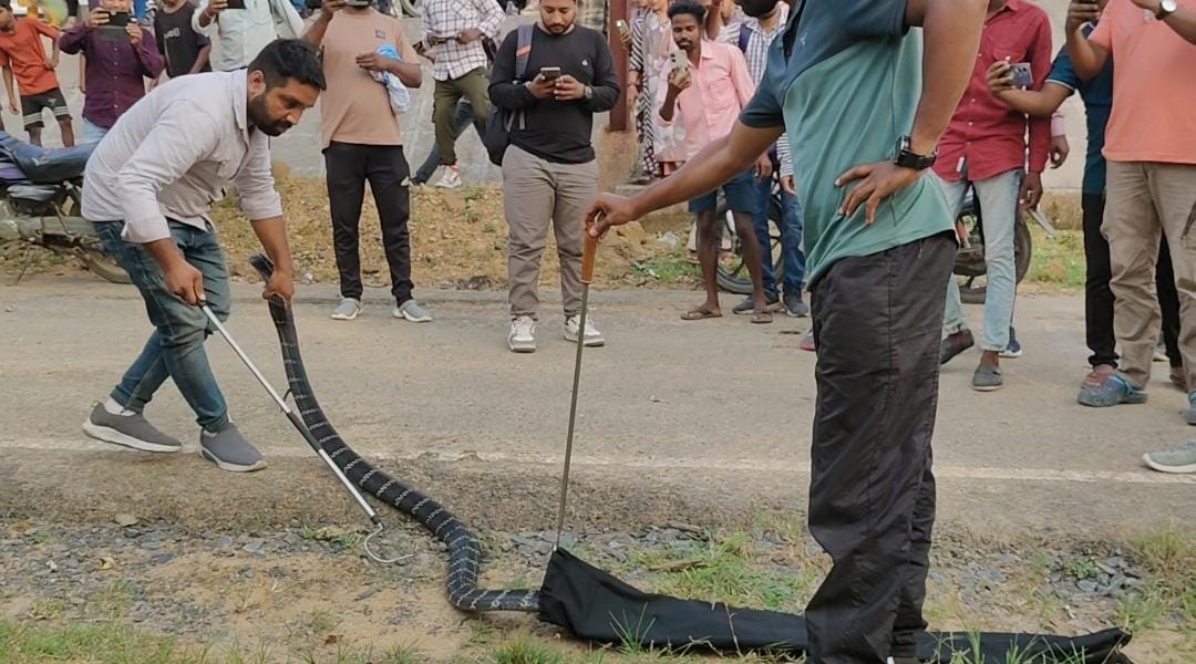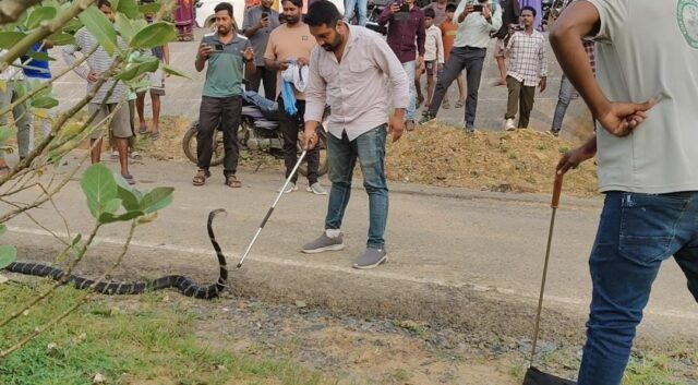 पर्यटन स्थल सतरेंगा से लौट रहे पर्यटकों ने रोड पार करते किंग कोबरा को गाड़ी से दबने से बचाया, कोरबा वन मण्डल के मार्गदर्शन में जितेंद्र सारथी ने किया गया सफल रेस्क्यु।