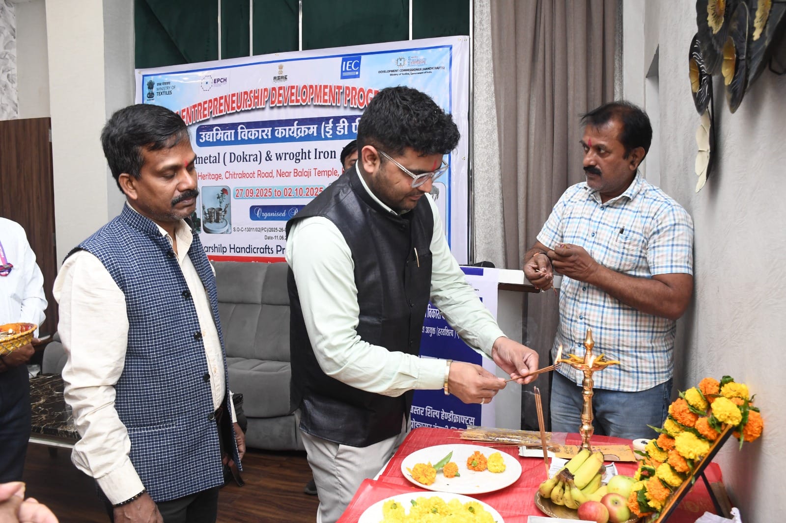 शहर के एक निजी होटल में शनिवार को छह दिवसीय उद्यमिता विकास कार्यक्रम (EDP) का शुभारंभ हुआ। कार्यक्रम का उद्घाटन मुख्य अतिथि श्री दीप्तांशु हलदार, क्षेत्रीय निदेशक ने दीप प्रज्वलन कर किया। इस अवसर पर विशेष अतिथि के रूप में श्री मनोज राठी, सहायक निदेशक, हस्तशिल्प सेवा केन्द्र, जगदलपुर उपस्थित रहे।