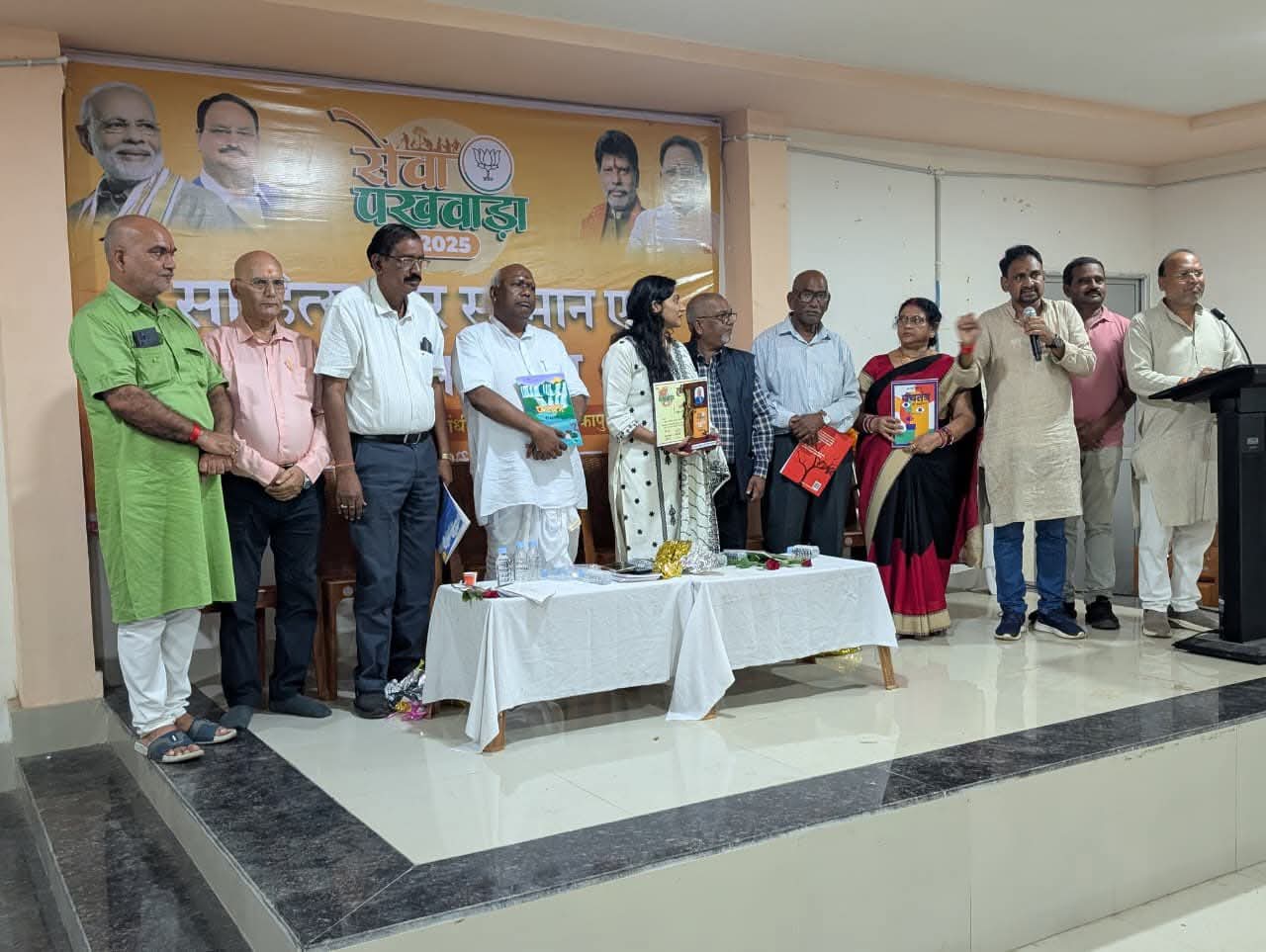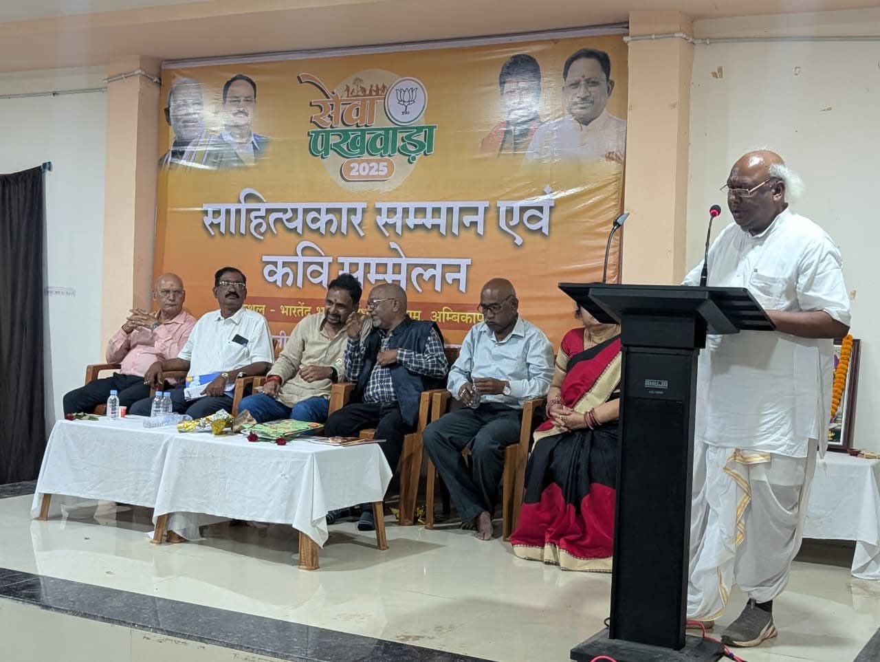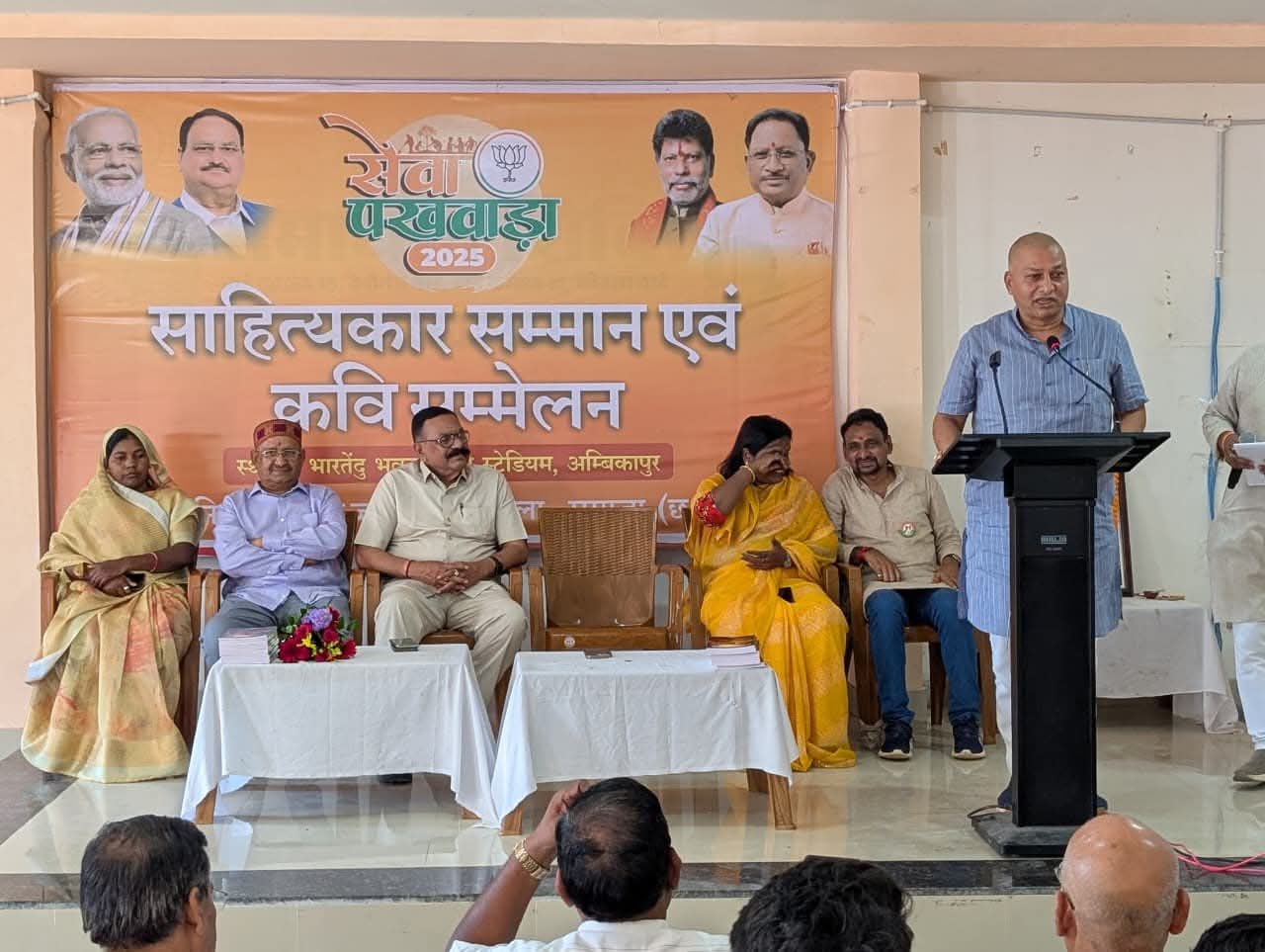 भाजपा के “सेवा पखवाड़ा अभियान” अंतर्गत “साहित्यकार सम्मान व कवि सम्मेलन” का आयोजन स्थानीय भारतेंदु भवन में सरगुजा सांसद चिंतामणी महाराज, भाजपा जिलाध्यक्ष भारत सिंह सिसोदिया, अंबिकापुर महापौर श्रीमती मंजूषा भगत, जिला पंचायत अध्यक्ष श्रीमती निरूपा सिंह, भाजपा वरिष्ठ नेता अनिल सिंह मेजर तथा पूर्व भाजपा जिलाध्यक्ष ललन प्रताप सिंह के आतिथ्य में आयोजित किया गया। इस अवसर पर सरगुजा सांसद चिंतामणी महाराज ने साहित्यकारों का सम्मान करते हुए कहा कि साहित्यकार समाज का दर्पण होता है जो समाज को दिशा दिखाता है। जिले व नगर के मूर्धन्य साहित्यकारों का सम्मान कर आज मैं भी स्वयं गौरवांवित हूं। इस अवसर पर भाजपा जिलाध्यक्ष भारत सिंह सिसोदिया ने कहा कि भाजपा ने भारत के प्रधानमंत्री नरेंद्र मोदी के जन्मदिन के अवसर पर 17 सितंबर से प्रारंभ हुए सेवा पखवाड़ा कार्यक्रम अंतर्गत रक्तदान, स्वास्थ्य शिविर, स्वच्छता अभियान, बुद्धिजीवी सम्मेलन सहित जनता से जुड़े कई कार्यक्रम आयोजित किए जिसमें साहित्यकारों का सम्मान कार्यक्रम भी एक कड़ी है। अपनी लेखनी से समाज में परिवर्तन व क्रांति लाने वाले आप सभी रचनाकारों का मैं भाजपा परिवार की ओर से कोटि कोटि अभिनंदन करता हूँ। इस अवसर पर भाजपा वरिष्ठ नेता अनिल सिंह मेजर ने कहा कि साहित्य और समाज एक दूसरे के पूरक हैं, बिना साहित्य के जीवन की कल्पना नहीं की जा सकती। इस अवसर पर भाजपा जिला उपाध्यक्ष व सेवा पखवाड़ा अभियान के प्रभारी विनोद हर्ष ने स्वागत उद्बोधन देते हुए कहा कि भाजपा एकमात्र ऐसी राजनीतिक पार्टी है जो हमेशा साहित्यकारों को सम्मानित व प्रतिष्ठित कर उनका मान-सम्मान बढ़ाती है। कार्यक्रम का संचालन भाजपा जिला संवाद प्रमुख संतोष दास सरल ने तथा आभार प्रदर्शन हिन्दी साहित्य परिषद सचिव कवि अंचल सिन्हा ने किया। कार्यक्रम में जिले व नगर के कई वरिष्ठ साहित्यकारों के साथ-साथ उभरते युवा कवियों ने अपनी बेहतरीन प्रस्तुतियों से श्रोताओं को मंत्रमुग्ध कर दिया जिनमें देवेन्द्र नाथ दुबे, डॉ सपन सिन्हा, राजेश पांडे अब्र, डॉ योगेन्द्र सिंह गहरवार, रंजीत सारथी, राजेश तिवारी, श्रीमती संध्या सिंह, एसपी जयसवाल, डॉ सुधीर पाठक, विनोद तिवारी, प्रताप पांडे, कृष्ण कांत पाठक, श्रीमती गीता दुबे, श्रीमती पूनम दुबे, श्रीमती मनसा शुक्ला, श्रीमती अनिता मन्दिलवार, श्रीमती राज लक्ष्मी पांडे, श्रीमती माधुरी जयसवाल, श्रीमती पूनम पांडे, श्रीमती सीमा तिवारी, श्रीमती अंजू पांडे, राजेन्द्र विश्वकर्मा, मुकुंद लाल साहू, रविन्द्र तिवारी, जय गुप्ता, चंद्र भूषण मिश्रा, शिशुपाल गुप्ता, आर एल विश्वकर्मा, अजय श्रीवास्तव, आकाश द्विवेदी, आंचल गुप्ता, सौम्या सोनी, सेजल सिंह, विकेश गुप्ता त