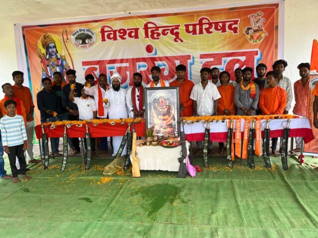 कार्यक्रम में मुख्य वक्ता विश्व हिंदू परिषद विभाग मंत्री रवि ब्रह्मचारी ने सभा को संबोधित करते हुए कहा कि सनातन संस्कृति की परंपरा में हमारे चारों युगों में शास्त्र और शस्त्र का उल्लेख मिलता है जब सारे विश्व में स्कूल नहीं थे तब हमारे भारत में गुरुकुल हुआ करते थे। गुरुकुल में शास्त्र के साथ साथ शस्त्र विद्या भी दी सिखाई जाती थी। क्योंकि विधर्मी सभी युगों में पाए गए इसलिए अपनी रक्षा अपनी संस्कृति, गौ, गंगा ,गीता की रक्षा के लिए शस्त्र अति आवश्यक हैं। शस्त्र उठाना पड़े तो उठाना ही चाहिए। विभाग संयोजक सिकंदर कश्यप ने कहा बजरंग दल पूरे देशभर में प्रतिवर्ष शस्त्र पूजन का आयोजन अपने सभी जिला केंद्रों एवं ग्रामीण स्तर पर करता है। इसका उद्देश्य अपने अंदर के पुरुषत्व को जगाने एवं अपनी सुरक्षा करना है। बजरंग दल पूरे देश में अपने कार्यकर्ताओं को त्रिशूल दीक्षा देता है। यह कलियुग है कलियुग की शक्ति सिर्फ संगठन है इसलिए हमें संगठित रहना चाहिए। विहिप बजरंग का कार्य ही हिंदुओं को संगठित करना है क्यों कि संगठित हिंदू ही सशक्त भारत का निर्माण कर सकता है। प्रखंड अध्यक्ष विवेक शुक्ला ने विहिप बजरंगदल कार्यकर्ताओं को संबोधित करते हुए बताया कि हमारे जितने भी देवी देवता हैं ,सभी के हाथों में शस्त्र हैं। इसलिए हम सभी सनातनी हिंदुओं के घरों में एक न एक शस्त्र रखना ही चाहिए, हिंसा के लिए नहीं अपितु अपनी सुरक्षा की दृष्टि से रखना चाहिए। आज पूरे देशभर में विधर्मी तत्व सनातन संस्कृति को मिटाने के लिए कई तरह के हथकंडे अपना रहे हैं इसलिए हमे भी अपने पूजा स्थल में शस्त्र रखना चाहिए। कार्यक्रम में विहिप बजरंग दल कार्यकर्ताओं ने अपने पारंपरिक शस्त्रों का मंत्रोच्चार के साथ पूजन किया। शस्त्र पूजन कार्यक्रम में विभाग मंत्री रवि ब्रह्मचारी, विभाग संयोजक सिकंदर कश्यप, उपाध्यक्ष जागेश्वर साहू, प्रखंड अध्यक्ष विवेक शुक्ला, मंत्री शंकर नाग, धर्म प्रसार प्रमुख शंकर बघेल, मंत्री शिवा नाग, संयोजक नेहरूलाल, सुरक्षा प्रमुख जैमन, अखाड़ा प्रमुख दिनेश बघेल, गौरक्षा प्रमुख मानसिंह, सेवा प्रमुख दसी पटेल, विद्यार्थी प्रमुख कृष्ण, मैथ्यू, प्रचार प्रमुख पवन, राजा, हरिदास, तिलु, नगर बस्तर प्रखंड के सभी पदाधिकारी एवं विहिप बजरंग दल कार्यकर्ता मौजूद रहे।