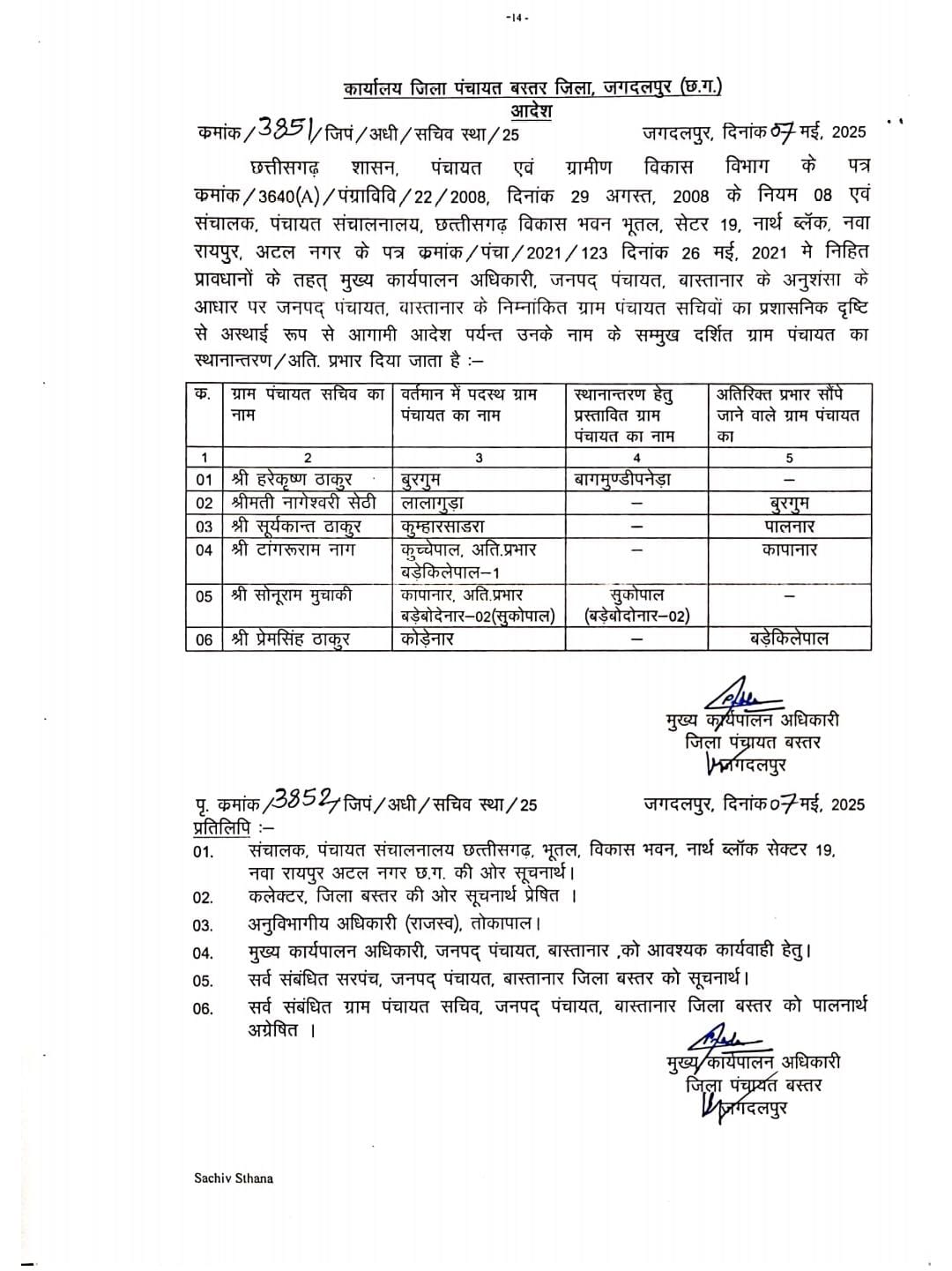 उल्लेखनीय है कि जिला पंचायत बस्तर के सीईओ ने बीते 7 मई को एक आदेश जारी कर बास्तानार जनपद की आधा दर्जन ग्राम पंचायतों के सचिवों के प्रभार में बदलाव किया था। कुछ सचिवों को अन्य ग्राम पंचायतों का अतिरिक्त प्रभार दिया गया था। इन सचिवों में टांगरू राम नाग भी शामिल हैं।टांगरू राम नाग वर्तमान में 2 पंचायतों के प्रभारी हैं। उन्हें जिला पंचायत सीईओ ने मई माह में जारी अपने आदेश से कापानार ग्राम पंचायत में पदस्थ करने के निर्देश दिए हैं। इस आदेश को जारी हुए 6 महीने बीत जाने के बावजूद आज तक उसे किलेपाल-1 के प्रभार से जनपद सीईओ ने मुक्त नहीं किया है। जबकि अन्य सचिव अपने स्थानांतरित जगह चले गए हैं। जनपदको सीईओ एसएस मंडावी इससे पहले जब बकावंड जनपद में पदस्थ थे तब भी ऐसा कारनामा करते थे। वे अपने कुछ चुनिंदा और चहेते पंचायत सचिवों पर विशेष रूप से कृपावान रहते थे। इन पंचायत सचिवों को ग्राम पंचायत के कार्यों में भ्रष्टाचार करने की खुली छूट दे दी गई थी। खुदा मेहरबान तो गधा पहलवान की तर्ज पर ये सचिव विभिन्न निर्माण कार्यों, केंद्र व राज्य सरकार की योजनाओं और 15वें वित्त मद की राशि में खुला खेल खेलते रहे हैं। सरकारी राशि की जमकर बंदरबांट होती रही। आलम यह था कि सचिवों के जरिए सरपंचों से एक सियासी दल को चंदा देने के नाम पर लाखों रुपए वसूले गए थे। यह मामला काफी तूल पकड़ चुका था।