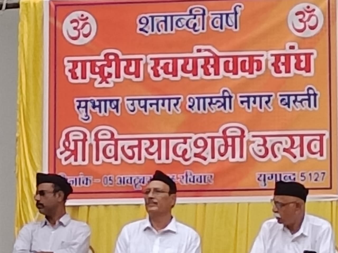 राष्ट्रीय स्वयं सेवक संघ शताब्दी वर्ष पर सुभाष उप नगर शास्त्री नगर बस्ती का विजयादशमी महोत्सव शारदा श्री उद्यान में आयोजित किया गया जिसमें स्वयं सेवक बड़ी संख्या में पथ संचलन करते हुए समारोह स्थल में पहुंचे जहां शारीरिक प्रमुख नरेश सिंह के मार्गदर्शन में स्वयं सेवकों ने दंड संचलन, योग तथा शारीरिक अभ्यास प्रदर्शन के साथ ही शस्त्र पूजन किया गया। पश्चात कुंदन सिंह ने मंचासिन अतिथि नगर संघ संचालक प्रदीप शर्मा, तारिणीश गौतम मुख्य वक्ता (कुल सचिव, अटल विश्व विद्यालय), लव चौबे कार्यक्रम अध्यक्ष का परिचय दिया।