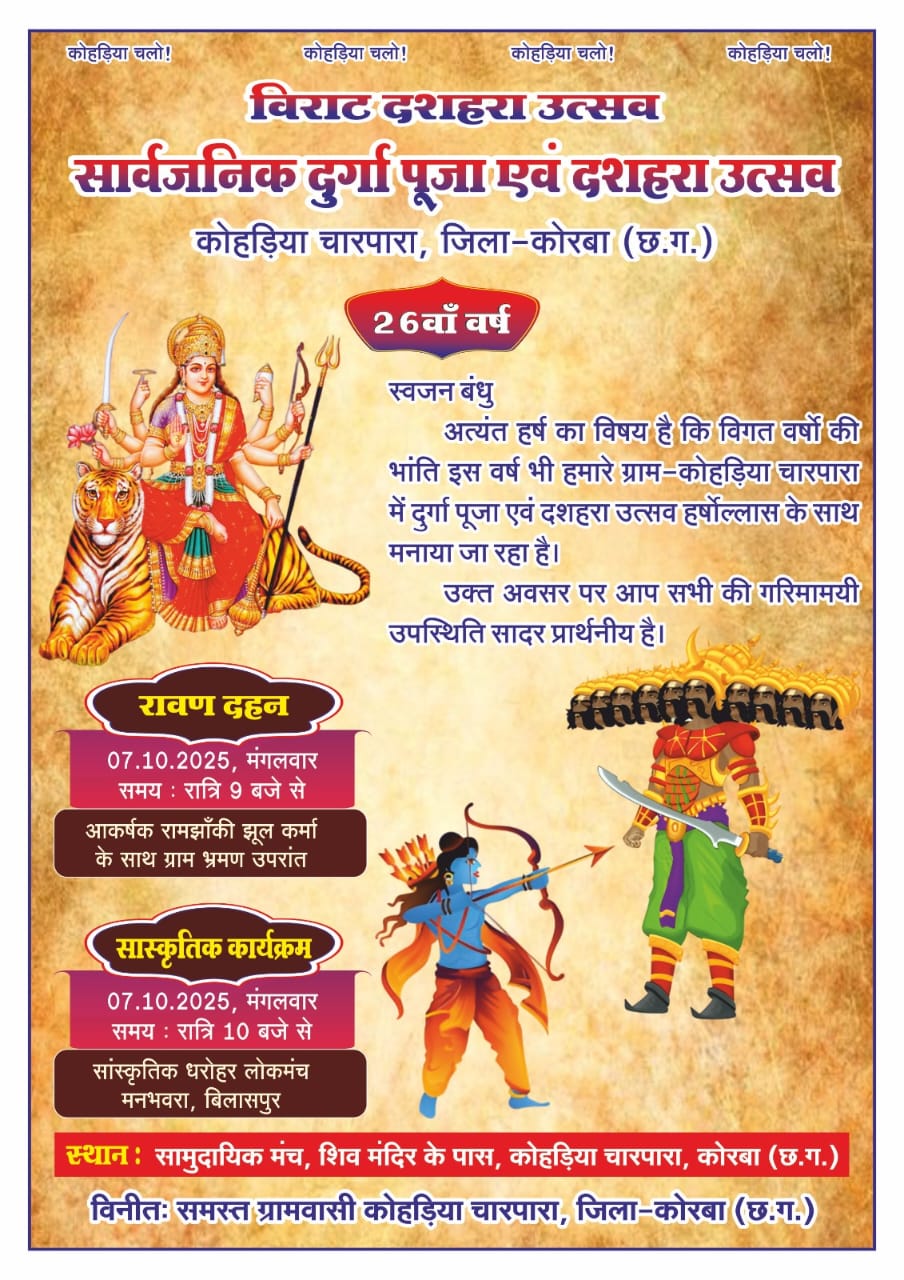 कोहड़िया चारपारा, वार्ड क्रमांक 18 में मंगलवार को विराट दशहरा उत्सव एवं सांस्कृतिक कार्यक्रम का आयोजन होगा। सार्वजनिक दुर्गा पूजा एवं दशहरा उत्सव समिति द्वारा विगत 26 वर्ष से लगातार धार्मिक एवं सांस्कृतिक धरोहर को सहेजते हुए कार्यक्रम आयोजित करता आ रहा है। समस्त ग्रामवासी कोहड़िया चारपारा एकजुटता की मिशाल पेश करते हुए हर वर्ष धूमधाम से दशहरा उत्सव का आयोजन किया जाता है।