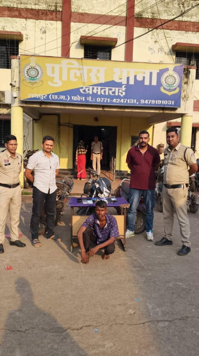 विवेचना दौरान सूचना मिली कि रावांभाठा स्थित हरीश पेट्रोल पंप के पास एक लड़का अपने पास एक मोटर सायकल फैशन प्रो कमांक सीजी 04 एचएल-7248 व विभिन्न कंपनी की मोबाइले बिक्री करने ग्राहक का तलाश कर रहा है, बाद तत्काल मौके पर पहुंचकर घेराबंदी कर सूचक के बताये हुलिया के लड़के को पकड़ा गया, जिससे पुछताछ करने पर अपना नाम सुमीत निषाद पिता पंचराम निषाद उम्र 20 साल निवासी आजाद नगर रावांभाठा रायपुर का रहने वाला बताया। उक्त संदेही से उनके पास रखे मोटर सायकल व मोबाईलों के संबंध में पूछताछ करने पर संतोषप्रद जवाब नहीं देने पर उनसे कड़ाई से पूछताछ करने पर उनके द्वारा मोटर सायकल फैशन प्रो क्रमांक सीजी 04 एलजेड-9371 को अंग्रेजी शराब दुकान भनपुरी से चोरी कर उसका नंबर प्लेट में पेन्ट लगाकर दूसरा नंबर सीजी 04 एचएल-7248 लिखकर उपयोग करना बताये।