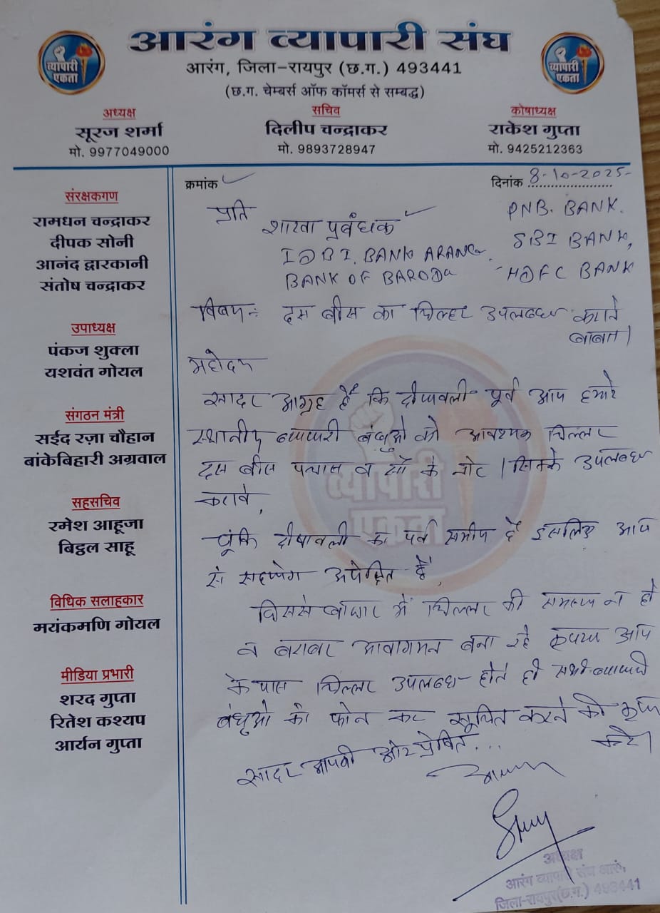 आरंग। दीपावली जैसे बड़े त्यौहार के मद्देनज़र बाजार में चिल्लर और सिक्कों की संभावित कमी को देखते हुए आरंग व्यापारी संघ के अध्यक्ष सूरज शर्मा ने पहल की है। शर्मा ने आरंग नगर की प्रमुख बैंकों — आईडीबीआई, बैंक ऑफ बड़ौदा, इंडसइंड, एचडीएफसी, एसबीआई और पीएनबी — के शाखा प्रबंधकों को पत्र लिखकर आग्रह किया है कि व्यापारियों और आम नागरिकों को समय पर पर्याप्त मात्रा में सिक्के और चिल्लर (₹10, ₹20, ₹50 और ₹100 के नोट) उपलब्ध कराए जाएं।