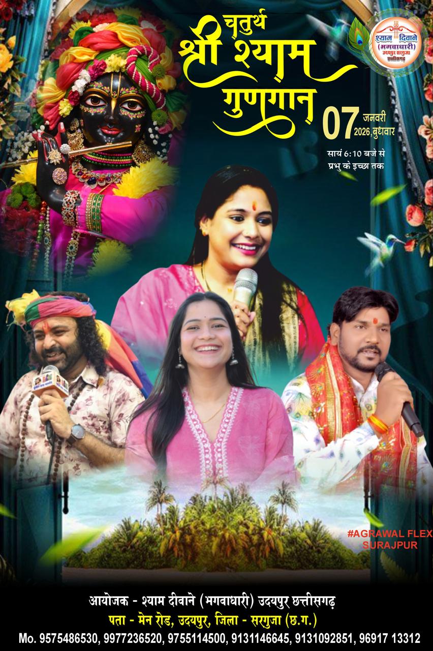 सरगुजा के उदयपुर में आगामी 7 जनवरी 2026 को श्याम बाबा के भव्य गुणगान का आयोजन किया जा रहा है, जिसके कार्यक्रम पोस्टर का विमोचन आज कैबिनेट मंत्री श्री राजेश अग्रवाल के द्वारा किया गया, इस कार्यक्रम के आयोजक श्याम दीवाने भगवाधारी के मनीष बंसल ने बताया कि लगातार चौथे वर्ष यह आयोजन किया जाएगा जिसमें भव्य निशान यात्रा निकली जाएगी एवं पूज्य श्री पप्पू महाराज जी के पावन सानिध्य में पूजा प्रारंभ की जाएगी, श्याम जगत के ख्याति प्राप्त भजन प्रवाहक रेशमी शर्मा (समस्तीपुर), सुनील डाया नामदेव (हिसार), कर्णिका ग्रोवर (नीमच),संतोष महंत(शक्ति) अपनी मनमोहक वाणी से बाबा श्याम के भजनों की अमृत वर्षा करेंगे, आयोजन के दौरान श्याम रसोई ओर बाबा के खजाना का ड्रॉ भी किया जाएगा जिसमें पुरस्कार में कार, बाइक , स्कूटी , सोने के सिक्के और अनेक पुरस्कार दिए जाएंगे, पोस्टर विमोचन के दौरान, मंत्री राजेश अग्रवाल, रवि अग्रवाल, सुनील अग्रवाल,राजेंद्र जायसवाल, राकेश अग्रवाल, राहुल अग्रवाल, विजय बंसल, विक्की गुप्ता, मनीष बंसल, दीपक सिंघल, सावन अग्रवाल, गौरव, अंकित, विकास, सत्यम एवं श्याम दिवाने की टीम उपस्थित थी