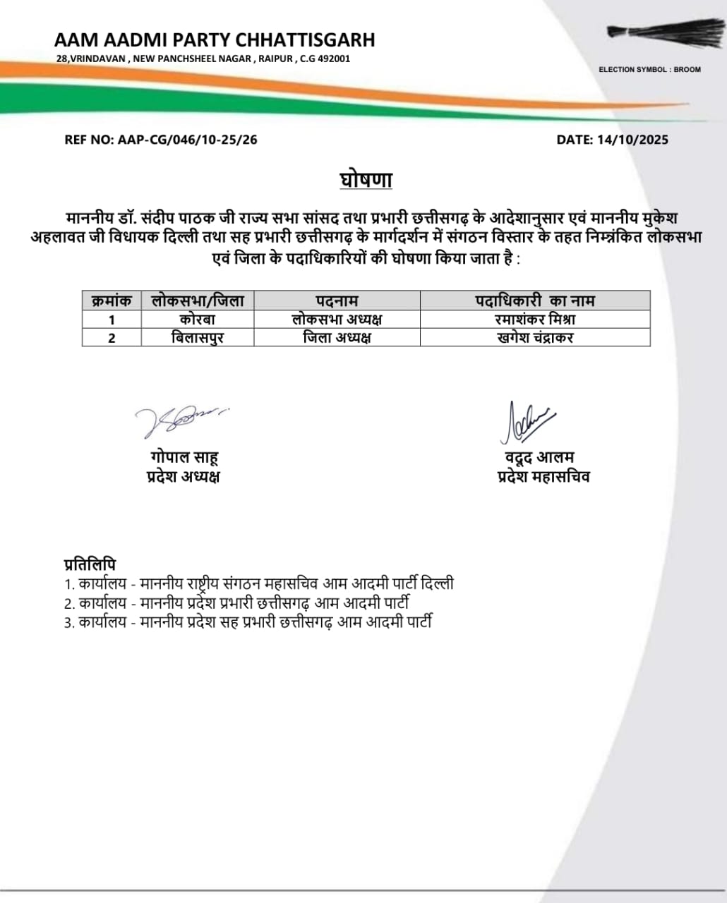 रमाशंकर मिश्रा जी ने बताया कि, आम आदमी पार्टी छत्तीसगढ़ में अपने संगठन को नये सिरे से बनाने की प्रक्रिया में है व अनुभवी और राजनीतिक समझ रखने वाले पुराने और नये कार्यकर्ताओं को महत्वपूर्ण पदों पर ज़िम्मेदारी दे रही है. कोरबा लोकसभा अध्यक्ष रमाशंकर मिश्रा ने आगे कहा की, आने वाले 2028 के विधानसभा चुनावों को लेकर राज्यसभा सांसद, राष्ट्रीय संगठन महामंत्री व प्रदेश प्रभारी संदीप पाठक जी पंजाब व गुजरात में अपने किये प्रयोगों को यहाँ ज़मीन पर उतारने की रणनीति पर कार्यरत हैं। जिसमें प्रदेश के सभी कार्यकर्ताओं की भूमिका अहम होगी। नई ज़िम्मेदारी मिलने पर रमाशंकर मिश्रा जी को प्रदेश उपाध्यक्ष व सभापति कृषि स्थायी समिति के जिला सदस्य (मनेंद्रगढ़-चिरमिरी-भरतपुर) श्रीमती सुखमंती सिंह जी, कोरबा लोकसभा उपाध्यक्ष विकास पांडेय जी, जिला महासचिव राजेश मंगतानी जी, जिला महामंत्री (संगठन) विश्वजीत पांडेय जी, मनेंद्रगढ़ विधानसभा प्रभारी सह कोषाध्यक्ष संदीप यादव जी, जिला ओबीसी मोर्चा अध्यक्ष नदीम हुसैन जी, जिला उपाध्यक्ष दुर्गा राव जी, रैनी तिवारी जी, संगोपत सिंह, जिला सचिव कासिम उमर जी, मनमोहन सांधे जी, प्रेमशंकर अहिरवार जी, शारदा प्रसाद यादव जी, राम लल्लू पटेल जी, राजू अहिरवार जी, कमलेश अहिरवार जी, गौरव मिश्रा जी,राजेन्द्र शुक्ला जी, रामा यादव जी, भोला राम चेरवा जी, सीता सिंह जी, गुलाबिया सिंह कंवर जी, सुनीता यादव जी, गजरूप सिंह जी,दिनेश बघेल जी, रामप्रवेश साहू जी, जाहिद अली जी, अनिल पासवान जी सहित सक्रिय कार्यकर्ता दीपक तिवारी जी, दीपक कुर्रे, विनोद जी, राजेंद्र प्रसाद जी,उज्ज्वल जी, हुसैन जी, संगीता दी, परुल जी, अफसर अली जी, अभिजीत जी, वाजिद अली जी, विवेक यादव जी, पवन सेन जी, अमित चक्रवर्ती जी सहित क्षेत्र के सभी कार्यकर्ताओं ने शुभकामनाएं प्रेषित कर बधाईयां दीं।