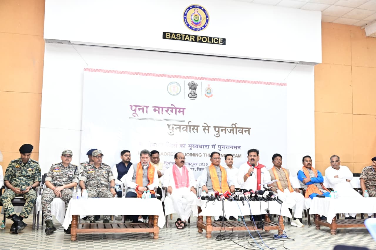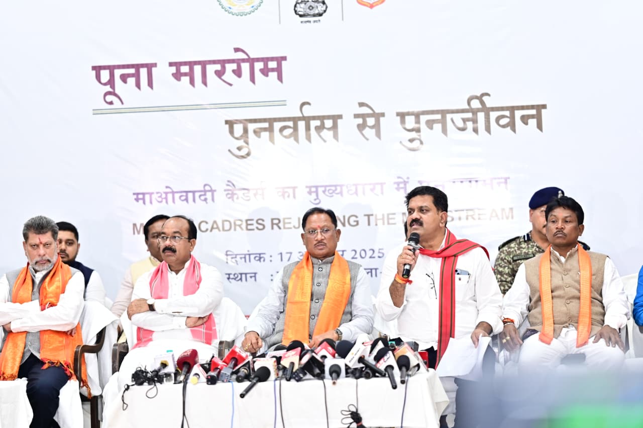 आत्मसमर्पित लोगों के पुनर्वास को लेकर हमारी नीति स्पष्ट रूप से समझाई जा रही है। आज माड़ डिवीजन की पूरी कमेटी, गढ़चिरौली की कमेटी, कंपनी वन, कंपनी दस, संचार टीम, प्रेस टीम, डॉक्टर टीम पूरी ने आत्मसमर्पण किया है। अब उत्तर पश्चिम क्षेत्र पूरी तरह क्लीयर हो चुका है। प्रेसवार्ता में उप मुख्यमंत्री अरुण साव, सांसद बस्तर महेश कश्यप, विधायक जगदलपुर किरण देव, विधायक चित्रकोट विनायक गोयल, विधायक दंतेवाड़ा चैतराम अटामी, छत्तीसगढ़ ब्रेवरेज कारपोरेशन के अध्यक्ष श्रीनिवास राव मद्दी, महापौर संजय पाण्डेय सहित अन्य जनप्रतिनिधि और पुलिस महानिदेशक अरुण देव गौतम, अतिरिक्त पुलिस महानिदेशक नक्सल ऑपरेशन विवेकानंद सिन्हा सहित सीआरपीएफ, बीएसएफ एवं आईटीबीपी के अतिरिक्त पुलिस महानिदेशक, कमिश्नर बस्तर डोमन सिंह, पुलिस महानिरीक्षक सुंदरराज पी, कलेक्टर हरिस एस, पुलिस अधीक्षक शलभ सिन्हा और कोंडागांव, नारायणपुर, दंतेवाड़ा, सुकमा एवं बीजापुर जिले के एसपी, सीआरपीएफ, बीएसएफ एवं आईटीबीपी के अधिकारी मौजूद रहे।