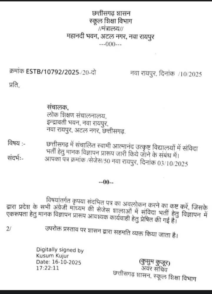 अर्जुन झा/जगदलपुर। छत्तीसगढ़ स्वामी आत्मानंद संविदा शिक्षक एवं कर्मचारी संघ के निरंतर प्रयासों के परिणाम स्वरूप राज्य शासन ने स्वामी आत्मानंद उत्कृष्ट विद्यालयों में संविदा भर्ती हेतु मानक विज्ञापन प्रारूप जारी करने का निर्णय लिया है। इस निर्णय को संघ द्वारा शासन के समक्ष प्रस्तुत 9 सूत्रीय मांगों में से एक प्रमुख मांग की दिशा में उठाया गया सकारात्मक कदम माना जा रहा है।