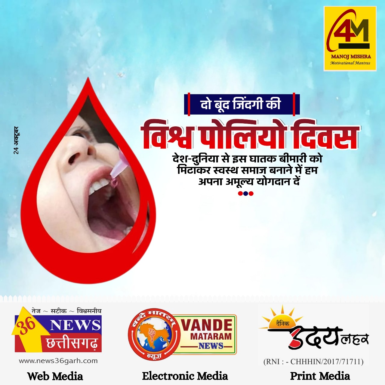 हर साल 24 अक्टूबर को विश्व पोलियो दिवस मनाया जाता है। इस दिन का उद्देश्य पोलियो जैसी घातक बीमारी के प्रति जागरूकता फैलाना और इसके उन्मूलन के लिए चलाए जा रहे वैश्विक प्रयासों को सम्मान देना है। यह दिन पोलियो वैक्सीन के जनक डॉ. जोनास सॉल्क की याद में मनाया जाता है, जिन्होंने पहला सफल पोलियो टीका विकसित किया था।