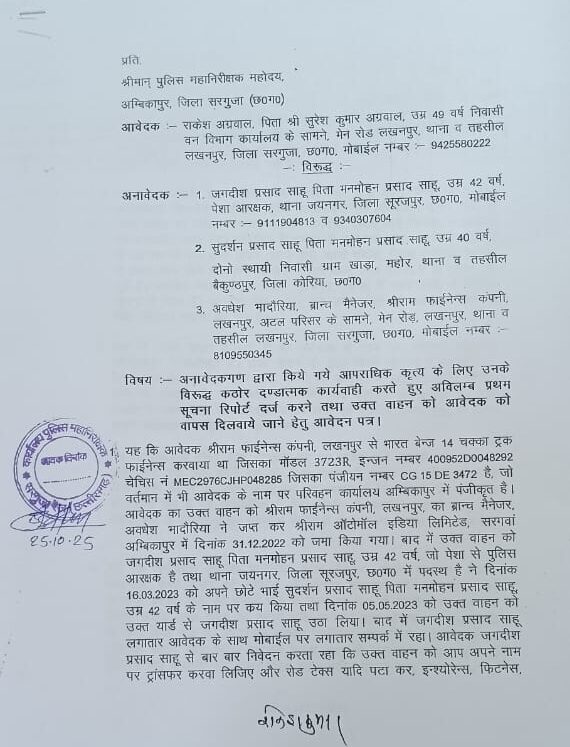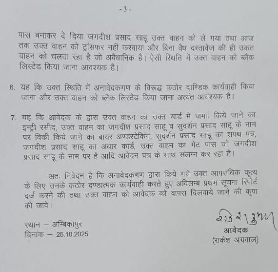 राकेश अग्रवाल ने यह भी बताया कि 18 अक्टूबर 2025 को उक्त वाहन घाटपेंडारी, थाना चंदोरा (जिला सूरजपुर) में इंजन सीज होने के बाद खराब हालत में पड़ा हुआ है। उन्होंने आशंका व्यक्त की कि वाहन को अब कबाड़ में बेचने का प्रयास किया जा रहा है।