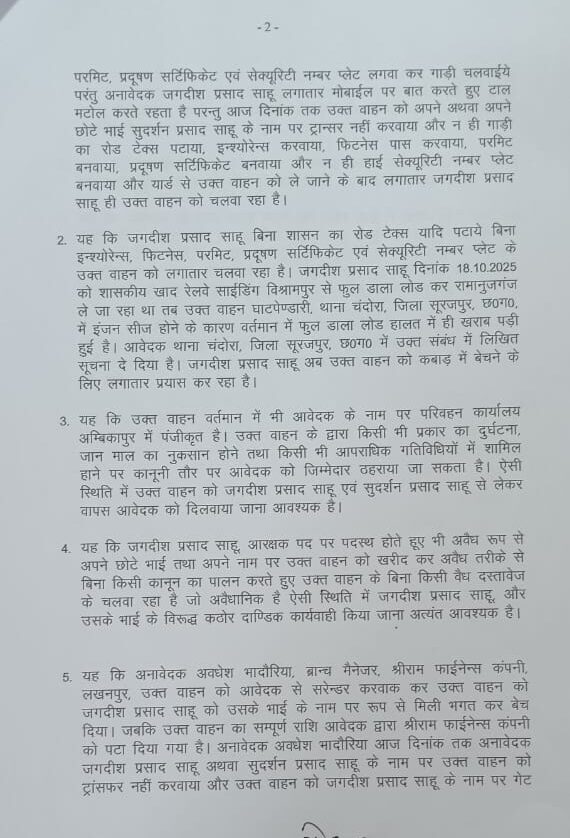 आवेदक के अनुसार, बाद में उक्त वाहन को जगदीश प्रसाद साहू (आरक्षक, थाना जयनगर, जिला सूरजपुर) ने अपने भाई सुदर्शन प्रसाद साहू के नाम पर 16 मार्च 2023 को खरीदा और 5 मई 2023 को ऑटोमॉल से उठा लिया। आवेदक का कहना है कि वाहन आज भी उनके नाम पर पंजीकृत है, किंतु अनावेदक बिना रोड टैक्स, बीमा, फिटनेस, परमिट, प्रदूषण प्रमाणपत्र और हाई सेक्यूरिटी नंबर प्लेट के वाहन का संचालन कर रहे हैं। बताया जा रहा है कि जगदीश साहू के द्वारा ट्रक में 18 अक्टूबर को विश्रामपुर रेप पॉइंट से शासकीय खाद 700 बोरी ओवरलोड लोडिंग कराया गया था आवेदक का कहना है कि मेरे द्वारा जगदीश साहू को सालों भर से गाड़ी का टैक्स पटा कर नाम ट्रांसफर करने के लिए कई बार निरंतर रिक्वेस्ट किया जा रहा था लेकिन जगदीश साहू के द्वारा टाल मटोल एवं आजकल करते हुए सालों भर से घुमाया जा रहा था गाड़ी बेचने के बाद संपूर्ण जिम्मेदारी नाम ट्रांसफर की क्रेता जगदीश साहू एवं श्रीराम फाइनेंस कंपनी की होती है