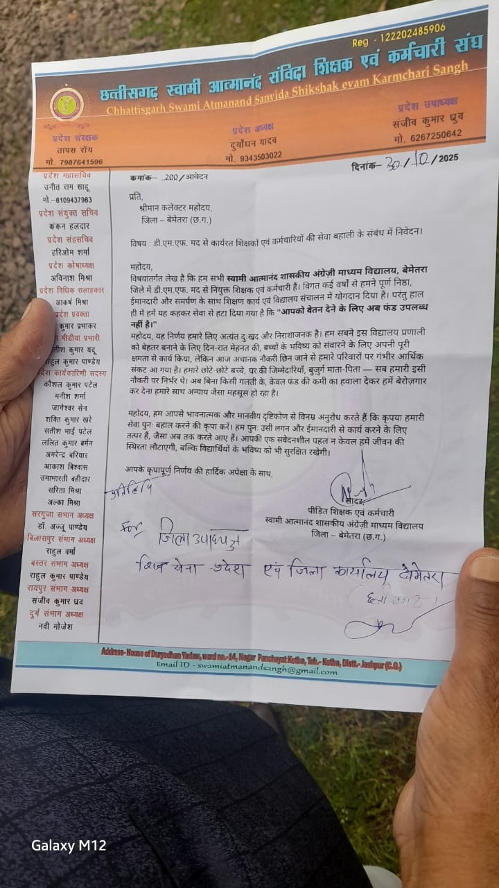 उन्होंने कलेक्टर महोदय से निवेदन किया कि मानवीय दृष्टिकोण से इस विषय पर संज्ञान लेते हुए उनकी सेवाओं को पुनः बहाल करने की कृपा करें, ताकि उनके परिवारों को जीवन की स्थिरता मिले और विद्यालय की शिक्षण प्रक्रिया निरंतर सुचारू रूप से चलती रहे।