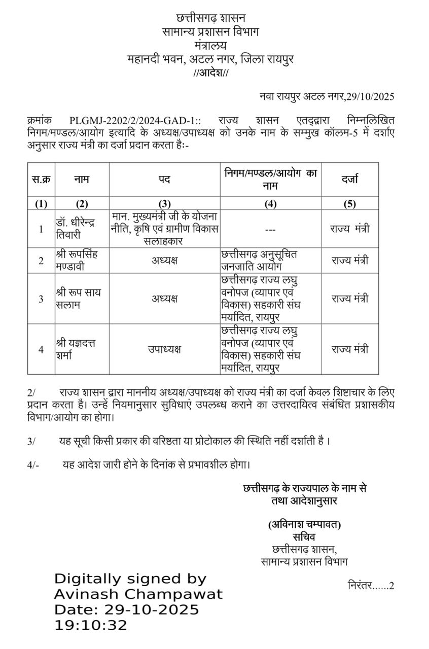 छत्तीसगढ़ शासन के मुख्यमंत्री विष्णुदेव साय के योजना, नीति, कृषि व ग्रामीण विकास सलाहकार डॉ. धीरेंद्र तिवारी को राज्यमंत्री का दर्जा दिया गया है। इस संबंध में कल सामान्य प्रशासन विभाग छत्तीसगढ़ द्वारा आदेश जारी किया गया।